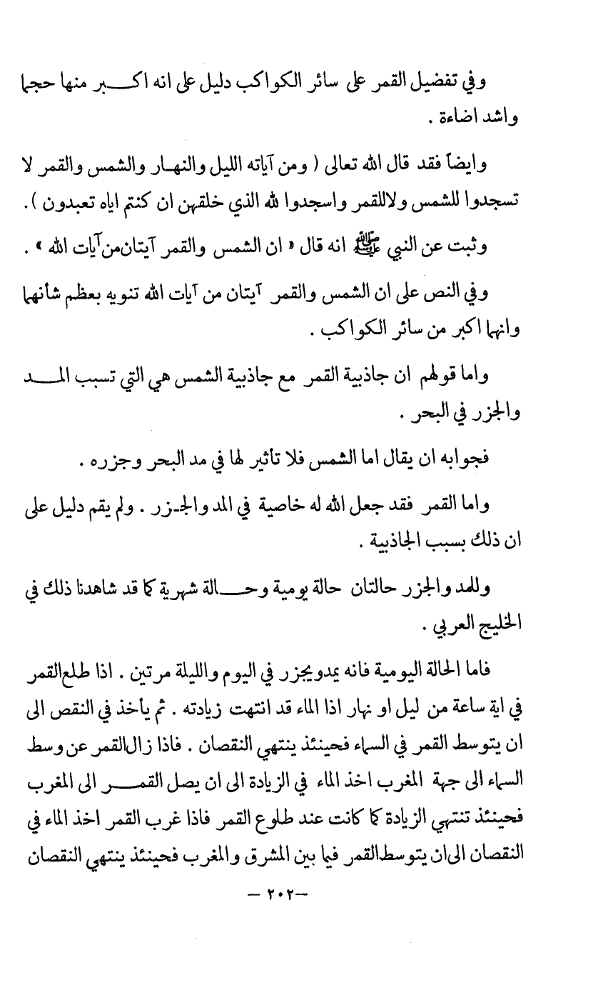 وأما القمر فقد جعل الله له خاصية في المد والجزر. ولم يقم دليل على أن ذلك بسبب الجاذبية.