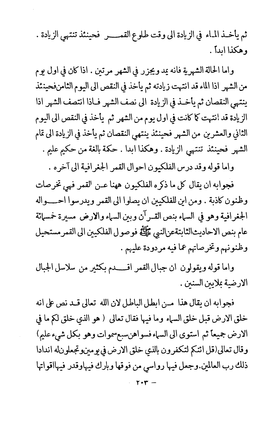 فجوابه أن يقال كل ما ذكره الفلكيون ههنا عن القمر فهي تخرصات وظنون كاذبة. ومن أين للفلكين أن يصلوا إلى القمر ويدرسوا أحواله الجغرافية وهو في السماء بنص القرآن وبين السماء والأرض مسيرة خمسمائة عام بنص الأحاديث الثابتة عن النبي - صلى الله عليه وسلم - فوصول الفلكيين إلى القمر مستحيل وظنونهم وتخرصاتهم عما فيه مردود عليهم.