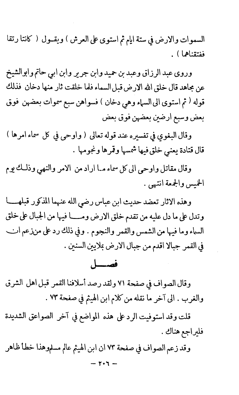 وقال الصواف في صفحة 71 ولقد رصد أسلافنا القمر قبل أهل الشرق والغرب. إلى آخر ما نقله من كلام ابن الهيثم في صفحة 73.