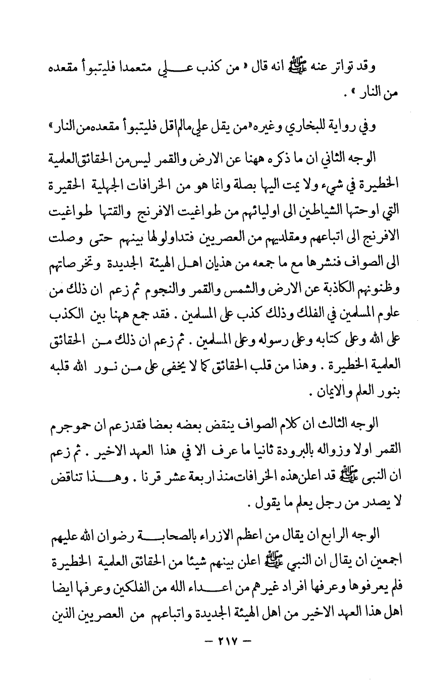 الوجه الرابع: أن يقال من أعظم الإزراء بالصحابة رضوان الله عليهم أجمعين أن يقال إن النبي - صلى الله عليه وسلم - أعلن بينهم شيئا من الحقائق العلمية الخطيرة فلم يعرفوها وعرفها أفراد غيرهم من أعداء الله من الفلكيين وعرفها أيضا أهل هذا العهد الأخير من أهل الهيئة الجديدة وأتباعهم من العصريين الذين
