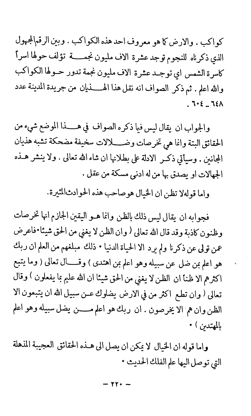 كواكب. والأرض كما هو معروف أحد هذه الكواكب. وبين الرقم المجهول الذي ذكرناه للنجوم توجد عشرة آلاف مليون نجمة تؤلف حولها أسرا كأسرة الشمس أي توجد عشرة آلاف مليون نجمة تدور حولها الكواكب والله أعلم. ثم ذكر الصواف أنه نقل هذا الهذيان من جريدة المدينة عدد 648 - 604.