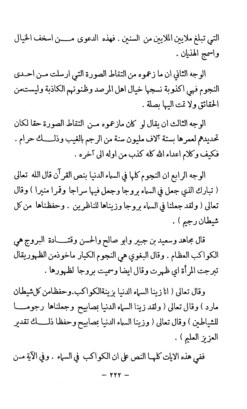 الوجه الرابع: أن النجوم كلها في السماء الدنيا بنص القرآن قال الله تعالى {تَبَارَكَ الَّذِي جَعَلَ فِي السَّمَاءِ بُرُوجًا وَجَعَلَ فِيهَا سِرَاجًا وَقَمَرًا مُنِيرًا} وقال تعالى {وَلَقَدْ جَعَلْنَا فِي السَّمَاءِ بُرُوجًا وَزَيَّنَّاهَا لِلنَّاظِرِينَ * وَحَفِظْنَاهَا مِنْ كُلِّ شَيْطَانٍ رَجِيمٍ}.