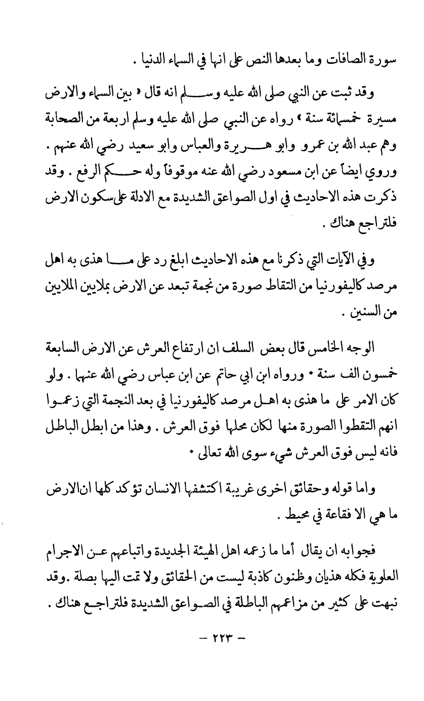 الوجه الخامس: قال بعض السلف أن ارتفاع العرش عن الأرض السابعة خمسون ألف سنة. ورواه ابن أبي حاتم عن ابن عباس رضي الله عنهما. ولو كان الأمر على ما هذى به أهل مرصد كاليفورنيا في بعد النجمة التي زعموا أنهم التقطوا الصورة منها لكان محلها فوق العرش. وهذا من أبطل الباطل, فإنه ليس فوق العرش شيء سوى الله تعالى.