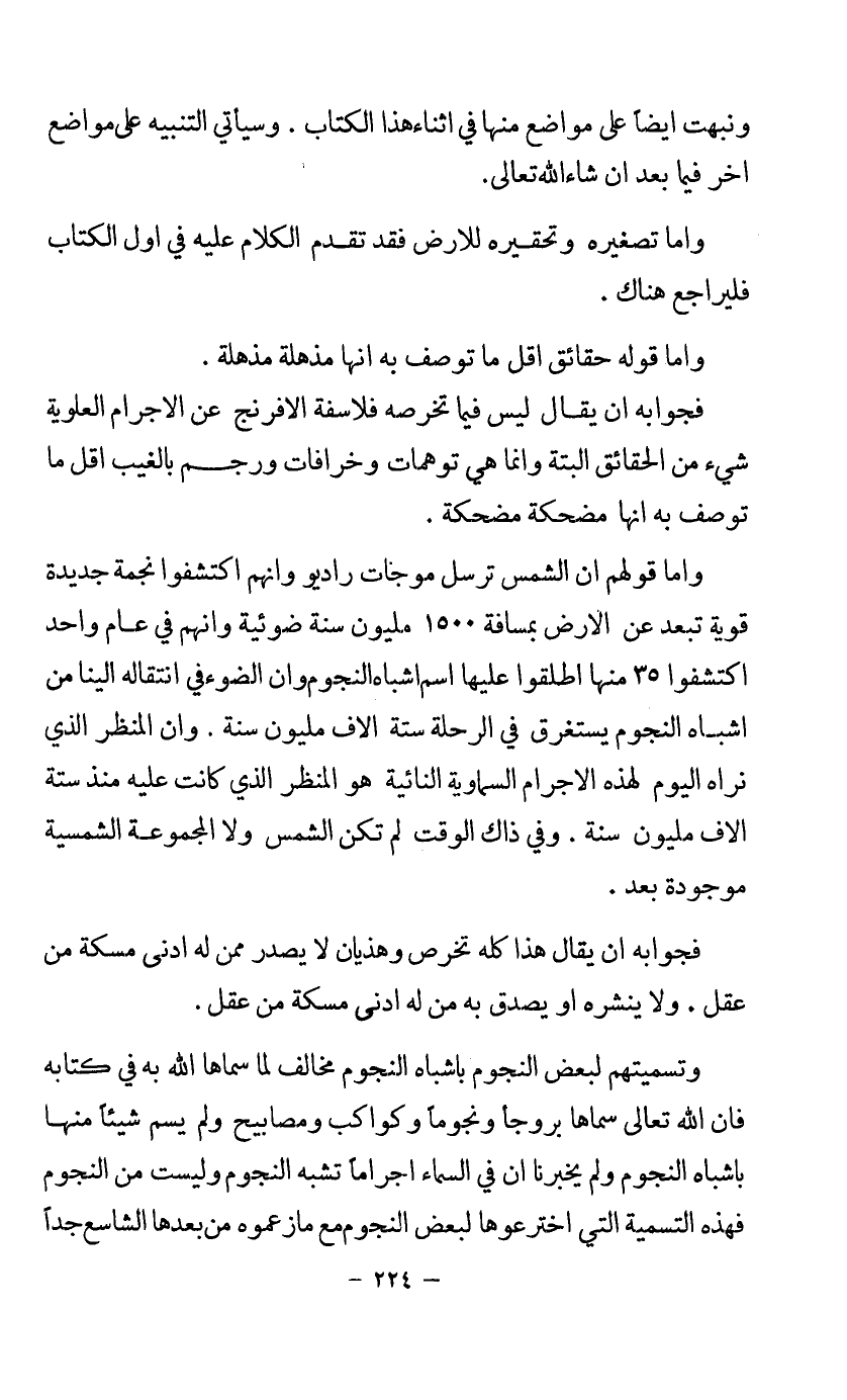 وأما قولهم أن الشمس ترسل موجات راديو وأنهم اكتشفوا نجمة جديدة قوية تبعد عن الأرض بمسافة 1500 مليون سنة ضوئية وأنهم في عام واحد اكتشفوا 35 منها أطلقوا عليها اسم أشباه النجوم وأن الضوء في انتقاله إلينا من أشباه النجوم يستغرق في الرحلة ستة آلاف مليون سنة. وأن المنظر الذي نراه اليوم لهذه الأجرام السماوية النائية هو المنظر الذي كانت عليه منذ ستة آلاف مليون سنة. وفي ذاك الوقت لم تكن الشمس ولا المجموعة الشمسية موجودة بعد.
