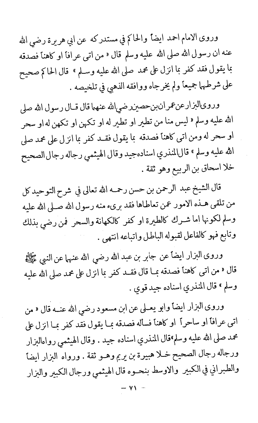 وروى البزار أيضا عن جابر بن عبد الله رضي الله عنهما عن النبي - صلى الله عليه وسلم - قال «من أتى كاهنًا فصدقه بما قال فقد كفر بما أنزل على محمد - صلى الله عليه وسلم -» قال المنذري إسناده جيد قوي.