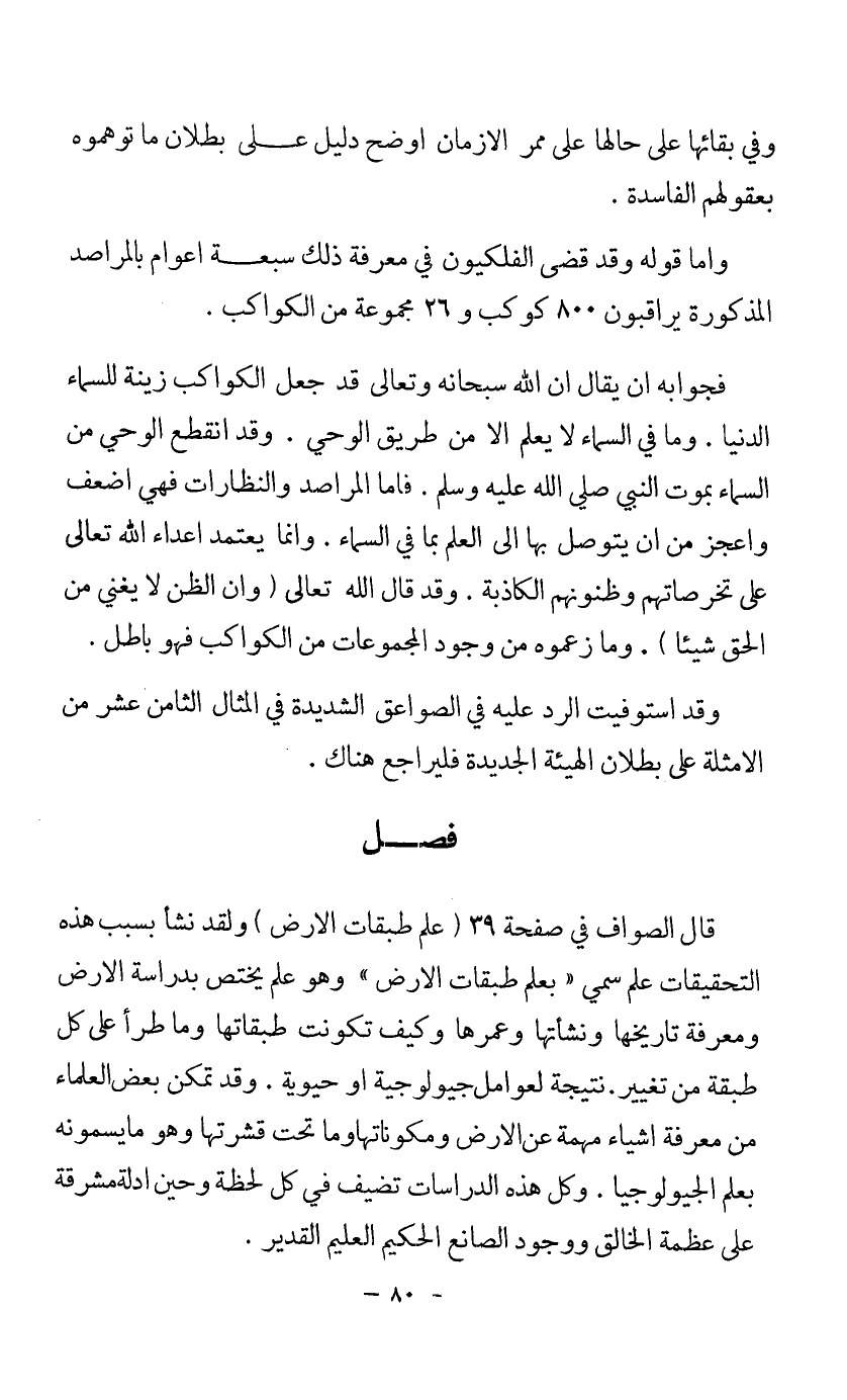 قال الصواف في صفحة 39: (علم طبقات الأرض) ولقد نشأ بسبب هذه التحقيقات على سمي (بعلم طبقات الأرض) وهو علم يختص بدراسة الأرض، ومعرفة تاريخها ونشأتها وعمرها، وكيف تكونت طبقاتها وما طرأ على كل طبقة من تغيير نتيجة لعوامل جيولوجية أو حيوية، وقد تمكن بعض العلماء من معرفة أشياء مهمة عن الأرض ومكوناتها وما تحت قشرتها وهو ما يسمونه بعلم الجيولوجيا، وكل هذه الدراسات تضيف في كل لحظة وحين أدلة مشرقة على عظمة الخالق ووجود الصانع الحكيم العليم القدير.