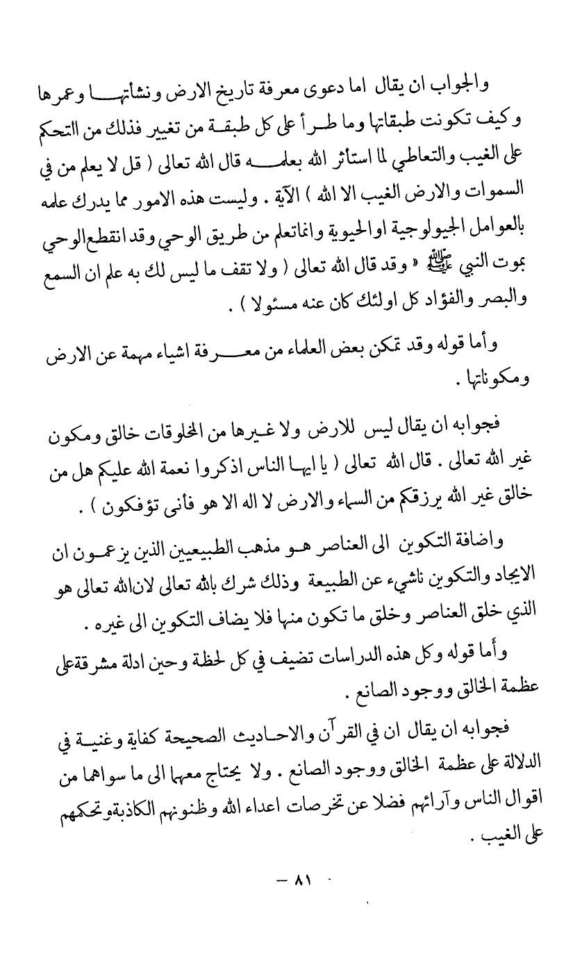 والجواب أن يقال أما دعوى معرفة تاريخ الأرض ونشأتها وعمرها وكيف تكونت طبقاتها وما طرأ على كل طبقة من تغيير، فذلك من التحكم على الغيب والتعاطي لما استأثر الله بعلمه قال الله تعالى {قُلْ لَا يَعْلَمُ مَنْ فِي السَّمَاوَاتِ وَالْأَرْضِ الْغَيْبَ إِلَّا اللَّهُ} الآية.
