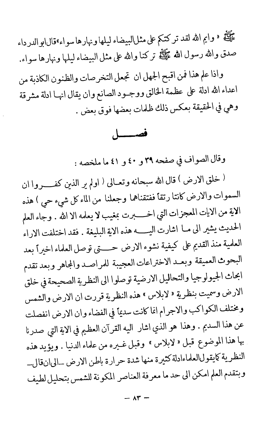(خلق الأرض) قال الله سبحانه وتعالى {أَوَلَمْ يَرَ الَّذِينَ كَفَرُوا أَنَّ السَّمَاوَاتِ وَالْأَرْضَ كَانَتَا رَتْقًا فَفَتَقْنَاهُمَا وَجَعَلْنَا مِنَ الْمَاءِ كُلَّ شَيْءٍ حَيٍّ} هذه الآية من الآيات المعجزات التي أخبرت بمغيب لا يعلمه إلا الله. وجاء العلم الحديث يشير إلى ما أشارت إليه هذه الآية البليغة. فقد اختلفت الآراء العلمية منذ القديم على كيفية نشوء الأرض حتى توصل العلماء أخيرا بعد البحوث العميقة وبعد الاختراعات العجيبة للمراصد والمجاهر وبعد ستقدم الأرض وسميت بنظرية "لابلاس" هذه النظرية قررت أن الأرض والشمس ومختلف الكواكب والأجرام إنما كانت سديمًا في الفضاء وأن الأرض انفصلت عن هذا السديم. وهذا هو الذي أشار إليه القرآن العظيم في الآية التي صرنا بها هذا الموضوع قبل "لابلاس" وقيل غيره من علماء الدنيا. ويؤيد هذه النظرية كما يقول العلماء أدلة كثيرة منها شدة حرارة باطن الأرض - إلى أن قال وبتقدم العلم أمكن إلى حد ما معرفة العناصر المكونة للشمس بتحليل لطيف