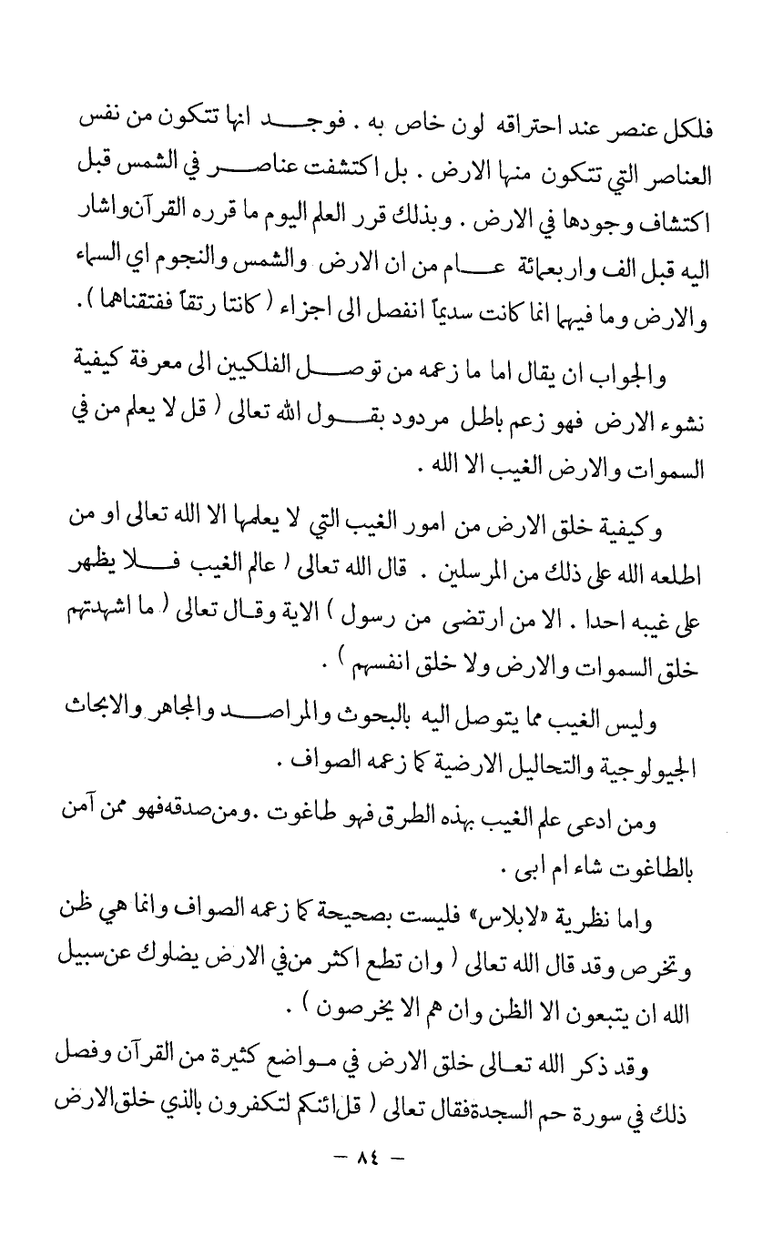 والجواب أن يقال أما ما زعمه من توصل الفلكيين إلى معرفة كيفية نشوء الأرض فهو زعم باطل مردود بقول الله تعالى {قُلْ لَا يَعْلَمُ مَنْ فِي السَّمَاوَاتِ وَالْأَرْضِ الْغَيْبَ إِلَّا اللَّهُ}.