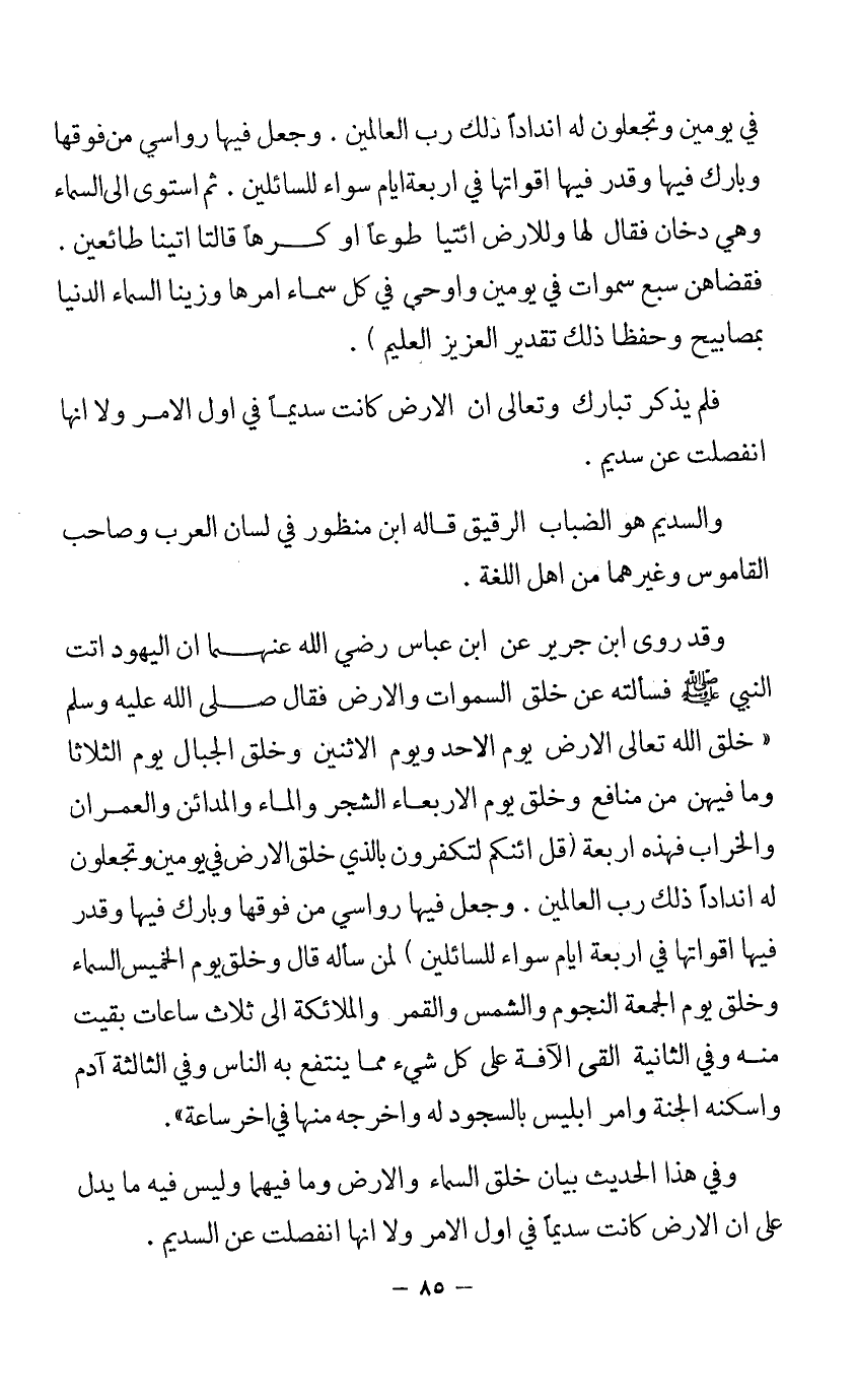 وفي هذا الحديث بيان خلق السماء والأرض وما فيهما، وليس فيه ما يدل عل أن الأرض كانت سديمًا في أول الأمر، ولا أنها انفصلت عن السديم.