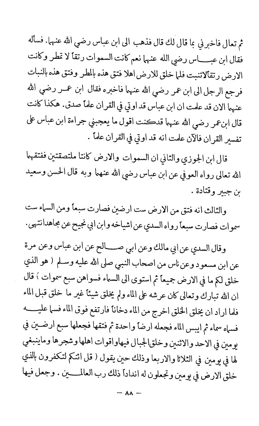 ثم تعال فأخبرني بما قال لك، قال فذهب إلى ابن عباس رضي الله عنهما فسأله فقال ابن عباس رضي الله عنهما: نعم كانت السموات رتقا لا تمطر، وكانت الأرض رتقا لا تنبت، فلما خلق للأرض أهلا فتق هذه بالمطر وفتق هذه بالنبات. فرجع الرجل إلى ابن عمر رضي الله عنهما فأخبره، فقال ابن عمر: الآن قد علمت أن ابن عباس قد أوتي في القرآن علمًا، صدق. هكذا كانت قال ابن عمر رضي الله عنهما: قد كنت أقول ما يعجبني جراءة ابن عباس على تفسير القرآن، فالآن علمت أنه قد أوتي في القرآن علما.