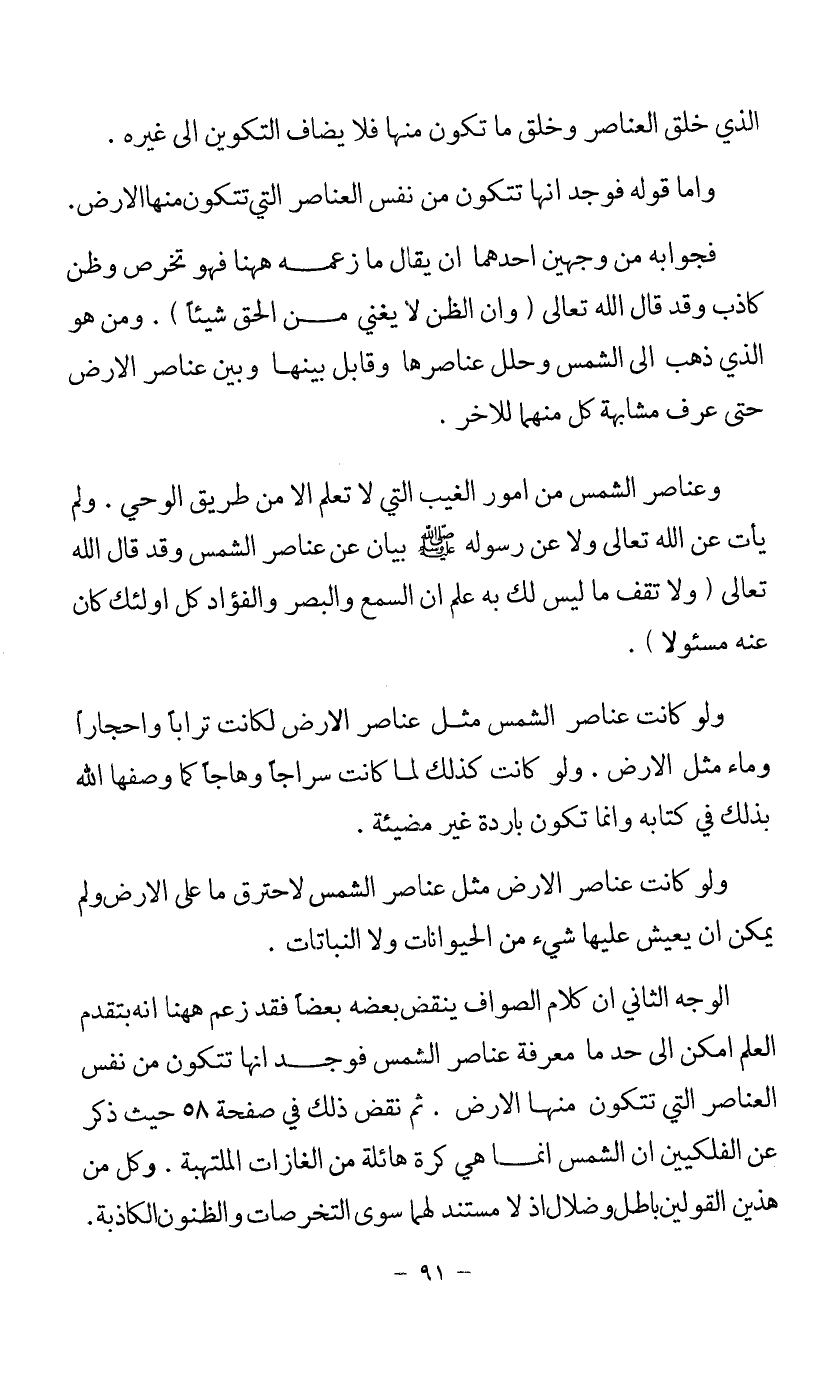 ولو كانت عناصر الشمس مثل عناصر الأرض لكانت ترابا وأحجارا وماء مثل الأرض، ولو كانت كذلك لما كانت سراجا وهاجا كما وصفها الله بذلك في كتابه وإنما تكون باردة غير مضيئة.