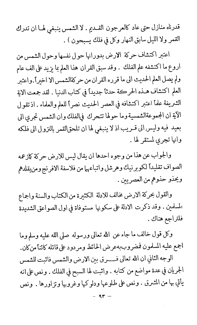 والقول بحركة الأرض مخالف للأدلة الكثيرة من الكتاب والسنة وإجماع المسلمين. وقد ذكرت الأدلة على سكونها مستوفاة في أول الصواعق الشديدة فلتراجع هناك.