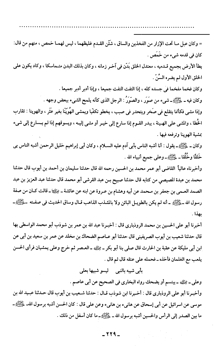 وأخبرناه عاليًا القاضى أبو عمر محمد بن الحسين رحمه الله قال حدثنا سليمان بن أحمد بن أيوب قال حدثنا محمد بن عبدة المصيصي من كتابه قال حدثنا صبيح بن عبد القرشى أبو محمد قال حدثنا عبد العزيز بن عبد الصمد العمى بن جعفر بن محمد عن أبيه وهشام بن عروة عن ابنه عن عائشة -رضي الله عنها- قالت كان من صفة رسول الله - صلى الله عليه وسلم - أنه لم يكن بالطويل البائن ولا بالمشذب الذاهب قال وساق الحديث في صفته - صلى الله عليه وسلم - بهذا.