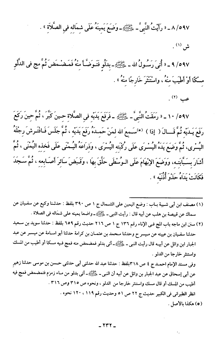 597/ 8 - "رَأَيْتُ النَّبِىَّ - صلى الله عليه وسلم - وَضَعَ يَمِينَهُ عَلَى شِمَالِهِ في الصَّلَاةِ".