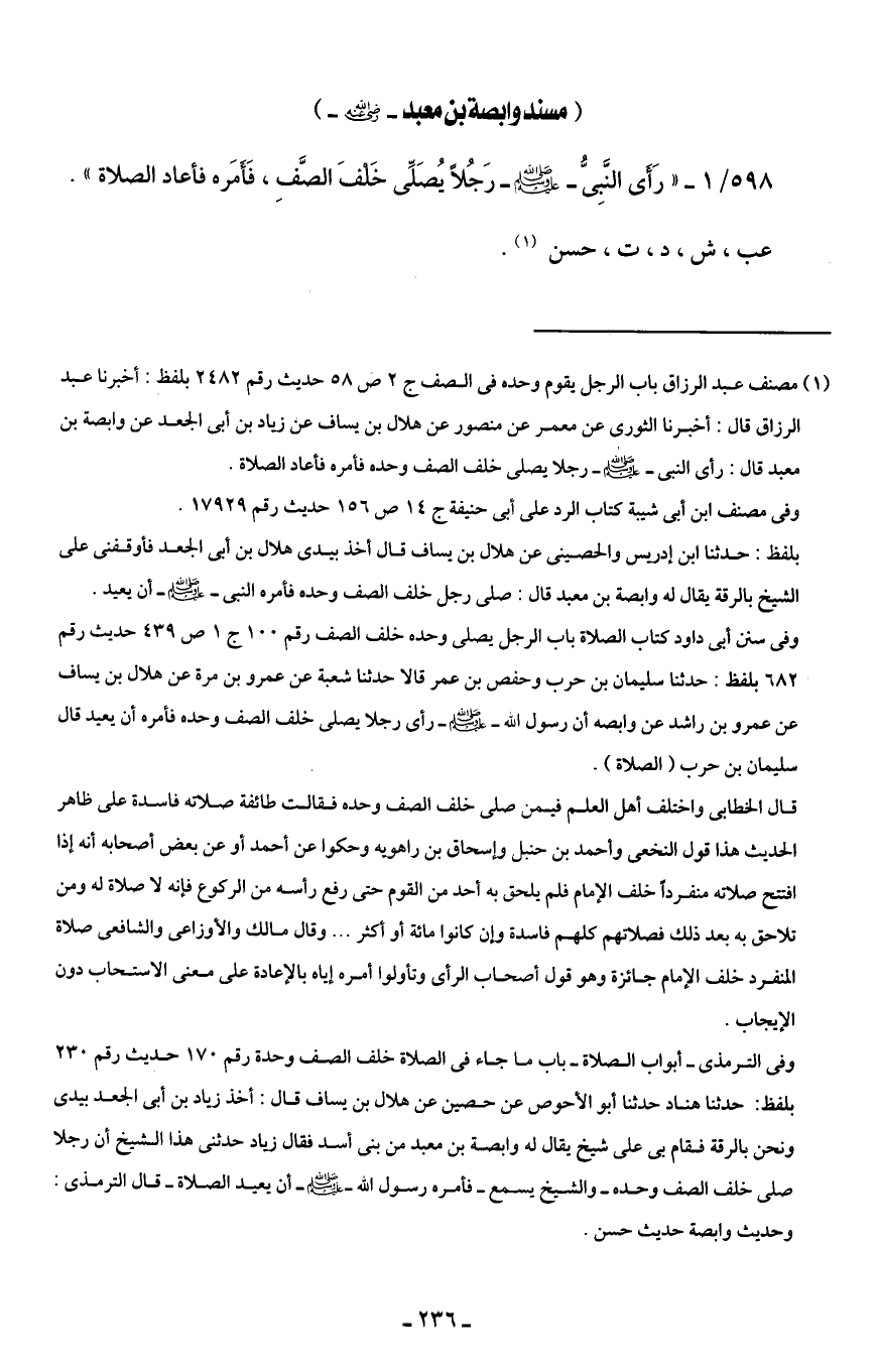 وفى الترمذى -أبواب الصلاة- باب ما جاء في الصلاة خلف الصف وحده رقم 170 حديث رقم 230 بلفظ: حدثنا هناد حدثنا أبو الأحوص عن حصين عن هلال بن يساف قال: أخذ زياد بن أبى الجعد بيدى ونحن بالرقة فقام بى على شيخ يقال له وابصة بن معبد من بنى أسد فقال زياد حدثنى هذا الشيخ أن رجلا صلى خلف الصف وحده -والشيخ يسمع- فأمره رسول الله - صلى الله عليه وسلم - أن يعيد الصلاة - قال الترمذى: وحديث وابصة حديث حسن.