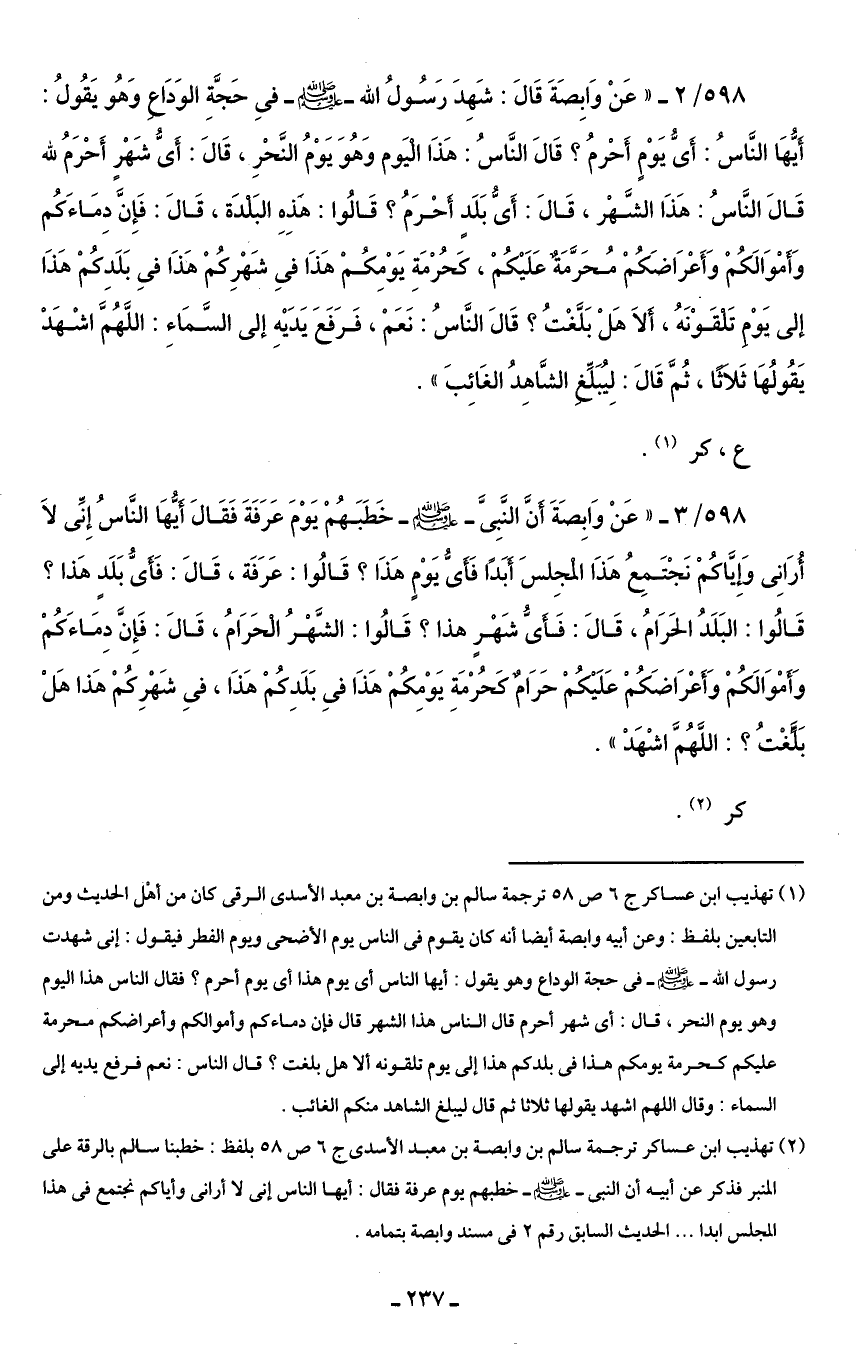 598/ 2 - "عَنْ وَابِصَةَ قَالَ: شَهِدَ رَسُولُ الله - صلى الله عليه وسلم - في حَجَّةِ الوَدَاع وَهُو يَقُولُ: ايُّهَا النَّاسُ: أىُّ يَوْمٍ أَحْرمُ؟ قَالَ النَّاسُ: هَذَا اليَوم وَهُوَ يَوْمُ النَّحْرِ، قَالَ: أَىُّ شَهْرٍ أَحْرَمُ لله قَالَ النَّاسُ: هَذَا الشَّهْر، قَالَ: أَىُّ بَلَدٍ أحْرَمُ؟ قَالُوا: هذِهِ البَلدَة، قَالَ: فَإِنَّ دِمَاءَكُم وَأمْوَالَكُمْ وَأَعْرَاضَكُمْ مُحَرَّمَة عَلَيْكُمْ، كَحُرْمَةِ يَوْمِكُمْ هَذَا في شَهْرِكُمْ هَذَا في بَلَدِكُمْ هَذَا إلى يَوْم تَلقَوْنَهُ، ألَا هَلْ بَلَّغْتُ؟ قَالَ النَّاسُ: نَعَمْ، فَرَفَعَ يَدَيْهِ إلى السَّمَاءِ: اللَّهُمَّ اشْهَدْ يَقُولُهَا ثَلاثا، ثُمَّ قَالَ: لِيُبَلِّغ الشَّاهِدُ الغَائِبَ".