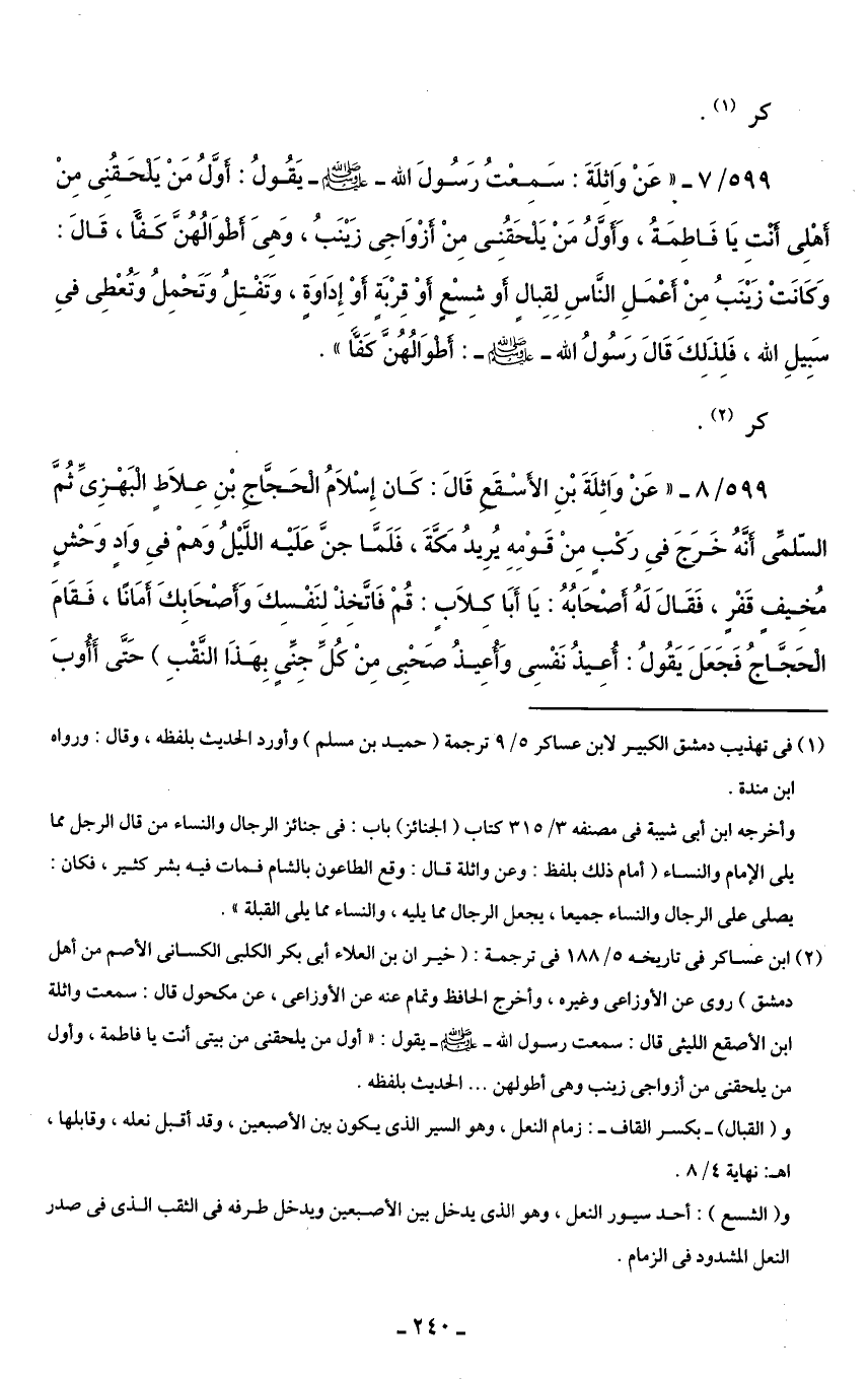 599/ 7 - "عَنْ وَاثِلَةَ: سَمِعْتُ رَسُولَ الله - صلى الله عليه وسلم - يقُولُ: أوَّلُ مَنْ يَلحَقُنِى مِنْ أهْلِى أنتِ يَا فَاطِمَةُ، وَأوَّلُ مَنْ يَلحَقُنِى مِنْ أزْوَاجِى زَيْنَبُ، وَهِىَ أطوَالُهُنَّ كَفًّا، قَالَ: وَكَانَتْ زَيْنَبُ مِنْ أعْمَلِ النَاسِ لِقِبال أو شِسْعٍ أوْ قِرْبَةٍ أوْ إِدَاوَة، وَتَفْتِلُ وَتَحْمِلُ وَتُعْطِى في سَبِيلِ الله، فَلِذَلِكَ قَالَ رَسُولُ الله - صلى الله عليه وسلم -: أطوَالُهُنَّ كَفًّا".