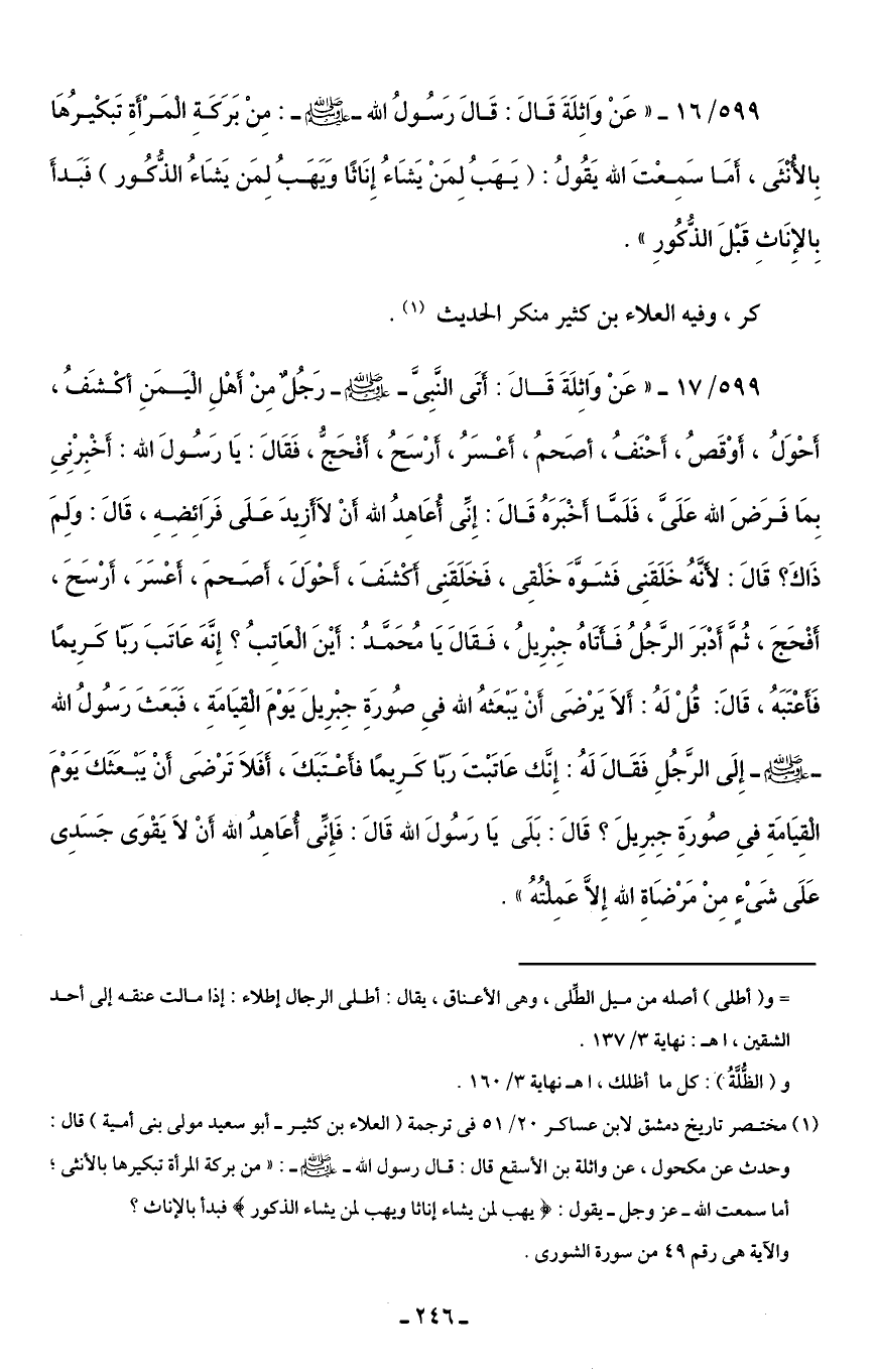 599/ 17 - "عَنْ وَاثِلَةَ قَالَ: أتَى النَّبِىَّ - صلى الله عليه وسلم - رَجُلٌ مِنْ أهْلِ اليَمَنِ أكْشَفُ، أحْوَلُ، أوْقَصُ، أَحْنَفُ، أصَحمُ، أَعْسَرُ، أرْسَحُ، أفْحَجُّ، فَقَالَ: يَا رَسُولَ الله: أَخْبِرْنِىِ بِمَا فَرَضَ الله عَلَى، فَلَمَّا أخْبَرَهُ قالَ: إِنِّى أعَاهِدُ الله أنْ لَا أزِيدَ عَلَى فَرَائِضِهِ، قَالَ: وَلِمَ ذَاكَ؟ قَالَ: لأنَّهُ خَلَقَنِى فَشَوَّهَ خَلقِى، فَخَلَقَنِى أكْشَفَ، أَحْوَلَ، أصَحمَ، أعْسَرَ، أَرْسَحَ، أفْحَجَ، ثُمَّ أَدْبَرَ الرَّجُلُ فَأتَاهُ جِبْرِيلُ، فَقَالَ يَا مُحَمدُ: أيْنَ العَاتِبُ؟ إِنَّهَ عَاتَبَ ربا كَرِيمًا فَأعْتَبَهُ، قَالَ: قُلْ لَهُ: أَلَا يَرْضَى أَنْ يَبْعَثهُ الله في صُورَةِ جِبْرِيلَ يَوْمَ القِيَامَةِ، فَبَعَثَ رَسُولُ الله - صلى الله عليه وسلم - إِلَى الرَّجُلِ فَقَالَ لَهُ: إِنك عَاتَبْتَ ربا كَرِيمًا فأعْتَبَكَ، أَفَلَا تَرْضَى أن يَبْعَثَكَ يَوْمَ القِيَامَةِ في صُورَةِ جِبرِيلَ؟ قَالَ: بَلَى يَا رَسُولَ الله قَالَ: فَإِنِّى أعَاهِدُ الله أَنْ لَا يَقْوَى جَسَدِى عَلَى شَىْءٍ مِنْ مَرْضَاةِ الله إِلَّا عَمِلتُهُ".