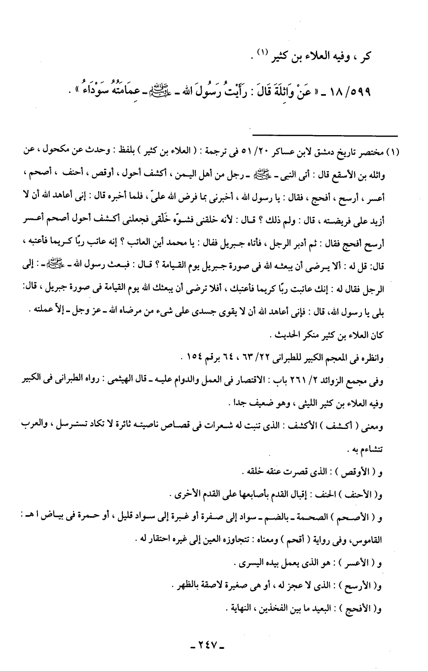 (¬1) مختصر تاريخ دمشق لابن عساكر 20/ 51 في ترجمة: (العلاء بن كثير) بلفظ: وحدث عن مكحول، عن واثله بن الأسقع قال: أتى النبى - صلى الله عليه وسلم - رجل من أهل اليمن، أكشف أحول، أوقص، أحنف، أصحم، أعسر، أرسح، أفحج، فقال: يا رسول الله، أخبرنى بما فرض الله علىّ، فلما أخبره قال: إنى أعاهد الله أن لا أزيد على فريضته، قال: ولم ذلك؟ قال: لأنه خلقنى فشوه خَلقى فجعلنى أكشف أحول أصحم أعسر أرسح أفحج فقال: ثم أدبر الرجل، فأتاه جبريل فقال: يا محمد أين العاتب؟ إنه عاتب ربا كريما فأعتبه، قال: قل له: ألا يرضى أن يبعثه الله في صورة جبريل يوم القيامة؟ قال: فبعث رسول الله - صلى الله عليه وسلم -: إلى الرجل فقال له: إنك عاتبت ربا كريما فأعتبك، أفلا ترضى أن يبعثك الله يوم القيامة في صورة جبريل، قال: بلى يا رسول الله، قال: فإنى أعاهد الله أن لا يقوى جسدى على شئ من مرضاه الله -عز وجل- إلا عملته. كان العلاء بن كثير منكر الحديث.