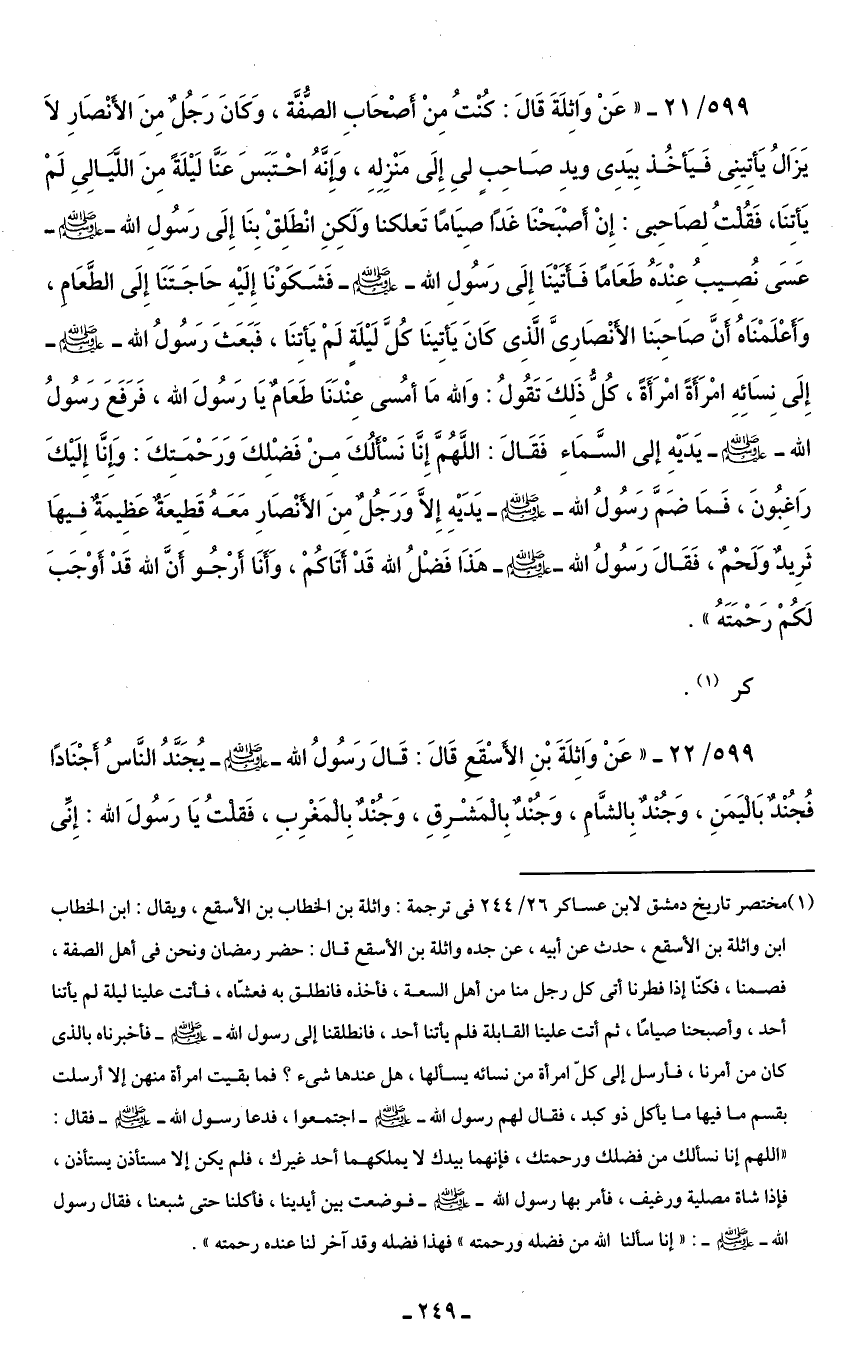 599/ 21 - "عَنْ وَاثِلَةَ قَالَ: كُنْتُ مِنْ أَصْحَابِ الصُّفَّة، وَكَانَ رَجُل مِنَ الأنْصَارِ لَا يَزَالُ يَأتِينِى فَيَأخُذ بِيَدِى ويدِ صَاحِبٍ لىِ إِلَى مَنْزِلِهِ، وَإنَّهُ احْتَبَسَ عَنَّا لَيْلَةً مِنَ اللَّيَالِىِ لَمْ يَأتِنَا، فَقُلتُ لِصَاحِبى: إِنْ أصْبَحْنَا غَدًا صِيَاما تَعلكنا وَلَكِنِ انْطَلِقْ بِنَا إِلَى رَسُولِ الله - صلى الله عليه وسلم - عَسَى نُصِيبُ عِنْدَهُ طَعَامًا فَأَتَيْنَا إِلَى رَسُولِ الله - صلى الله عليه وسلم - فَشَكَوْنَا إِلَيْهِ حَاجَتَنَا إِلَى الطَّعَام، وَأعْلَمْنَاهُ أنَّ صَاحِبَنا الأنْصَارِىَّ الَّذِى كَانَ يَأتِينَا كُلَّ لَيْلَةٍ لَمْ يَأتِنَا، فَبَعَثَ رَسُولُ الله - صلى الله عليه وسلم - إِلَى نِسَائِهِ امْرَأَةً امْرَأَةً، كُل ذَلِكَ تَقُولُ: وَالله مَا أُمسى عِنْدَنَا طَعَام يَا رَسُولَ الله، فَرَفَعَ رَسُولُ الله - صلى الله عليه وسلم - يَدَيْهِ إلى السَّمَاءِ فَقَالَ: اللَّهُمَّ إِنَّا نَسْأَلُكَ مِنْ فَضْلِكَ وَرَحْمَتِكَ: وَإنَّا إِلَيْكَ رَاغِبُونَ، فَمَا ضَمَّ رَسُولُ الله - صلى الله عليه وسلم - يَدَيْهِ إِلَّا وَرَجُل مِنَ الأنْصَارِ مَعَهُ قَطِيعَة عَظِيمَة فِيهَا ثَرِيد وَلَحْم، فَقَالَ رَسُولُ الله - صلى الله عليه وسلم - هَذَا فَضْلُ الله قَدْ أتَاكُمْ، وَأنَا أرْجُو أن الله قَدْ أوْجَبَ لَكُمْ رَحْمَتَهُ".