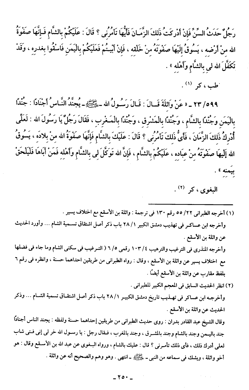 599/ 23 - "عَنْ وَاثِلَةَ قَالَ: قَالَ رَسُولُ اللَه - صلى الله عليه وسلم - يُجنَّدُ النَّاسُ أجْنَادًا: جندًا باليَمَنِ وَجندا بِالشَّام، وَجندًا بِالمَشْرِقِ، وَجندًا بِالمَغْرِبِ، فَقَالَ رَجُل يَا رَسُولَ الله: لَعَلِّى أُدْرِكُ ذَلِكَ الزَّمَانَ، فَأى ذَلِكَ تَأمُرُنِى؟ قَالَ: عَلَيْكَ بِالشَّام فَإِنَّهَا صَفْوَةُ الله مِنْ بِلادَهِ، يَسُوقُ الله إليهَا صَفْوَتَهُ مِنْ عِبَادِهِ، عَلَيْكُمْ بِالشام، فَإِنَّ الله تَوَكَّلَ لِى بِالشَّام وَأهْلِهِ فَمَنْ أَبَاهَا فَليَلحَقْ بِيَمنه".