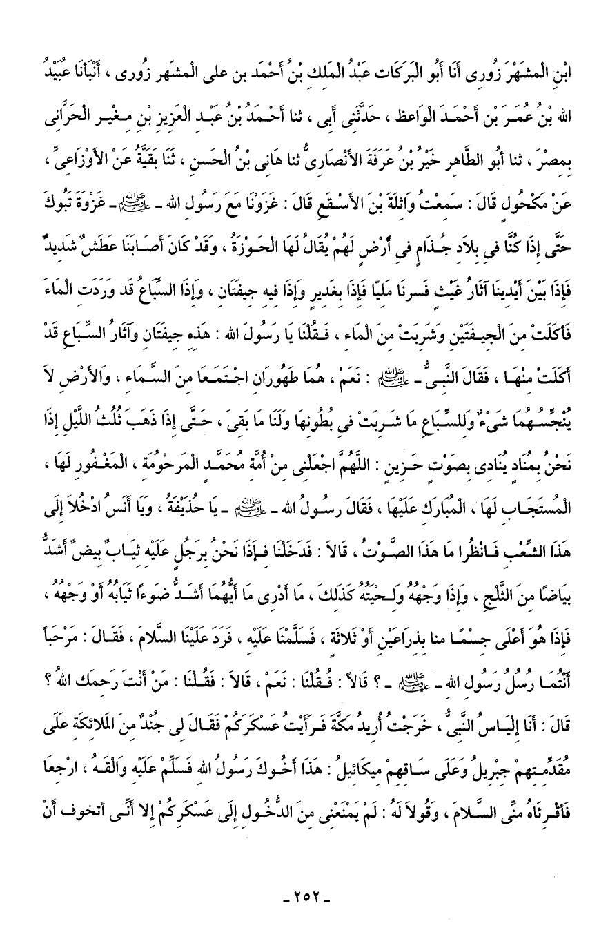 ابْنِ المشَهْرَ زُورِى أَنَا أَبُو البَرَكَات عَبْدُ المَلِكِ بْنُ أَحْمَد بن على المشَهر زُورى، أَنْبَأنَا عُبَيْدُ الله بْنُ عُمَرَ بْن أَحْمَدَ الوَاعظ، حَدثَنِى أَبِى، ثنا أَحْمَدُ بْنُ عَبْدِ العَزِيزِ بْنِ مِغْير الحَرَّانِى بِمِصْرَ، ثنا أبُو الطَّاهِر خَيْرُ بْنُ عَرَفَةَ الأنْصَارِىُّ ثنا هَانِى بْنُ الحَسنِ، ثَنَا بَقَيَّةُ عَنْ الأوْزَاعِىِّ، عَنْ مَكْحُولٍ قَالَ: سَمِعْتُ وَاثِلَةَ بْنَ الأَسْقَع قَالَ: غَزَوْنَا مَعَ رَسُولِ الله - صلى الله عليه وسلم - غَزْوَةَ تبُوكَ حَتى إِذَا كُنا في بِلَادِ جُذَام في أرْضٍ لَهُمْ يُقَالُ لَهَا الحَوْزَةُ، وَقَدْ كَانَ أَصَابَنَا عَطَشٌ شَدِيد فَإِذَا بَينَ أيْدِينَا آثَارُ غَيْثٍ فَسرنَا مَلِيّا فَإِذَا بِغَدِير وَإِذَا فِيهِ جِيفَتَانِ، وَإِذَا السِّباعُ قَد وَرَدَتِ المَاءَ فَأكَلَتْ مِنَ الجِيفَتَيْنِ وَشَرِبَتْ مِنَ المَاءِ، فَقُلنَا يَا رَسُولَ الله: هَذِهِ جِيفَتَانِ وَآثَارُ السِّبَاع قَدْ أكَلَتْ مِنْهَا، فَقَالَ النَّبِىُّ - صلى الله عليه وسلم - نَعَمْ، هُمَا طَهُورَانِ اجْتَمَعَا مِنَ السَّمَاءِ، وَالأرْضِ لَا ينجِّسُهُمَا شَىْء وَلِلسِّبَاع مَا شَرِبَتْ في بُطُونِهَا وَلَنَا مَا بَقِىَ، حَتَّى إِذَا ذَهَبَ ثُلُثُ اللَّيْلِ إِذَا نَحْنُ بِمُنَادٍ يُنَادِى بِصَوْتٍ حَزِينٍ: اللَّهُمَّ اجْعَلنِى مِنْ أمَّةِ مُحَمَّد المَرحْوُمَةِ، المَغْفُورِ لَهَا، المُستَجَابِ لَهَا، المُبَارَكِ عَلَيْهَا، فَقَالَ رسُولُ الله - صلى الله عليه وسلم - يَا حُذَيْفَةُ، وَيَا أَنَسُ ادْخُلَا إِلَى هَذَا الشِّعْبِ فَانْظُرا مَا هَذَا الصَّوْتُ، قَالَا: فَدَخَلنَا فَإِذَا نَحْنُ بِرَجُلٍ عَلَيْهِ ثِيَاب بِيض أَشَدُّ بيَاضًا مِنَ الثَّلج، وَإذَا وَجْهُهُ وَلِحْيَتُهُ كَذَلِكَ، مَا أَدْرِى مَا أَيُّهُمَا أشَدُّ ضَوءًا ثَيَابُهُ أَوْ وَجْهُهُ، فَإِذَا هُوَ أعْلَى جِسْمًا منا بِذِرَاعَيْنِ أَوْ ثَلاثَةٍ، فَسَلَّمْنَا عَلَيْهِ، فَرَدَ عَلَيْنَا السَّلامَ، فَقَالَ: مَرْحَبا أنتُمَا رُسُلُ رَسُولِ اللهِ - صلى الله عليه وسلم -؟ قَالا: فُقُلنَا: نَعَمْ، قَالَا: فَقُلنَا: مَنْ أَنْتَ رَحِمَك اللهُ؟ قَالَ: أنَا إِليَاسُ النَّبِىُّ، خَرَجْتُ أرِيدُ مَكَّةَ فَرَأَيْتُ عَسْكَرَكُمْ فَقَالَ لِى جند مِنَ المَلائِكَةِ عَلَى مُقَدِّمِتِهمْ جِبْرِيلُ وَعَلَى سَاقِهِمْ مِيكَائِيلُ: هَذَا أخُوكَ رَسُولُ اللهِ فَسَلِّمْ عَلَيْهِ وَالقَهُ، ارْجِعَا فَأقْرِئَاهُ منِّى السلامَ، وَقُولَا لَهُ: لَمْ يَمْنَعْنِى مِنَ الدُّخُولِ إِلَى عَسْكَرِكُمْ إِلا أنى أتخوف أنْ