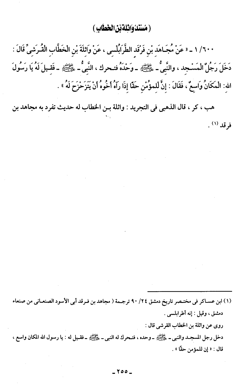 600/ 1 - " عَنْ مُجَاهَدِ بْنِ فَرْقَدٍ الطَّرَابُلسِى، عَنْ وَاثِلَةَ بْنِ الخَطَّابِ القُرَشِىِّ قَالَ: دَخَلَ رَجُلٌ المَسْجِد، والنَّبِىُّ - صلى الله عليه وسلم - وَحْدَهُ فتحرك، النَّبِىُّ - صلى الله عليه وسلم - فَقِيلَ لَهُ يَا رَسُولَ اللهِ: المَكَانُ وَاسِعٌ، فَقَالَ: إِن للِمؤُمْنِ حَقًا إِذَا رآهُ أخُوهُ أنْ يَتَزَحْزَحَ لَهُ".