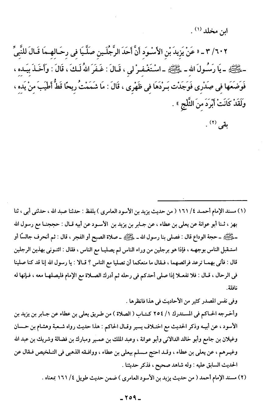 602/ 3 - "عَنْ يَزِيدَ بْنِ الأسْوَدِ أَنَّ أَحَدَ الرَّجُلَينِ صَلَّيَا فِى رِحَالِهِمَا قَالَ للنَبِى - صلى الله عليه وسلم - يَا رَسُولَ اللهِ - صلى الله عليه وسلم - اسْتَغْفِرْ لىِ، قَالَ: غَفَرَ اللهُ لَكَ، قَالَ: وَأَخَذَ بِيَدِهِ، فَوَضَعَها فِى صَدْرِى فَوَجَدْت بَرْدَهَا فِى ظَهْرِى، قَالَ: مَا شَمَمْتُ رِيحًا قَط أَطيَبَ مِنْ يَدِهِ، وَلَقَدْ كَانَتْ أبْرَدَ مِنَ الثلج".