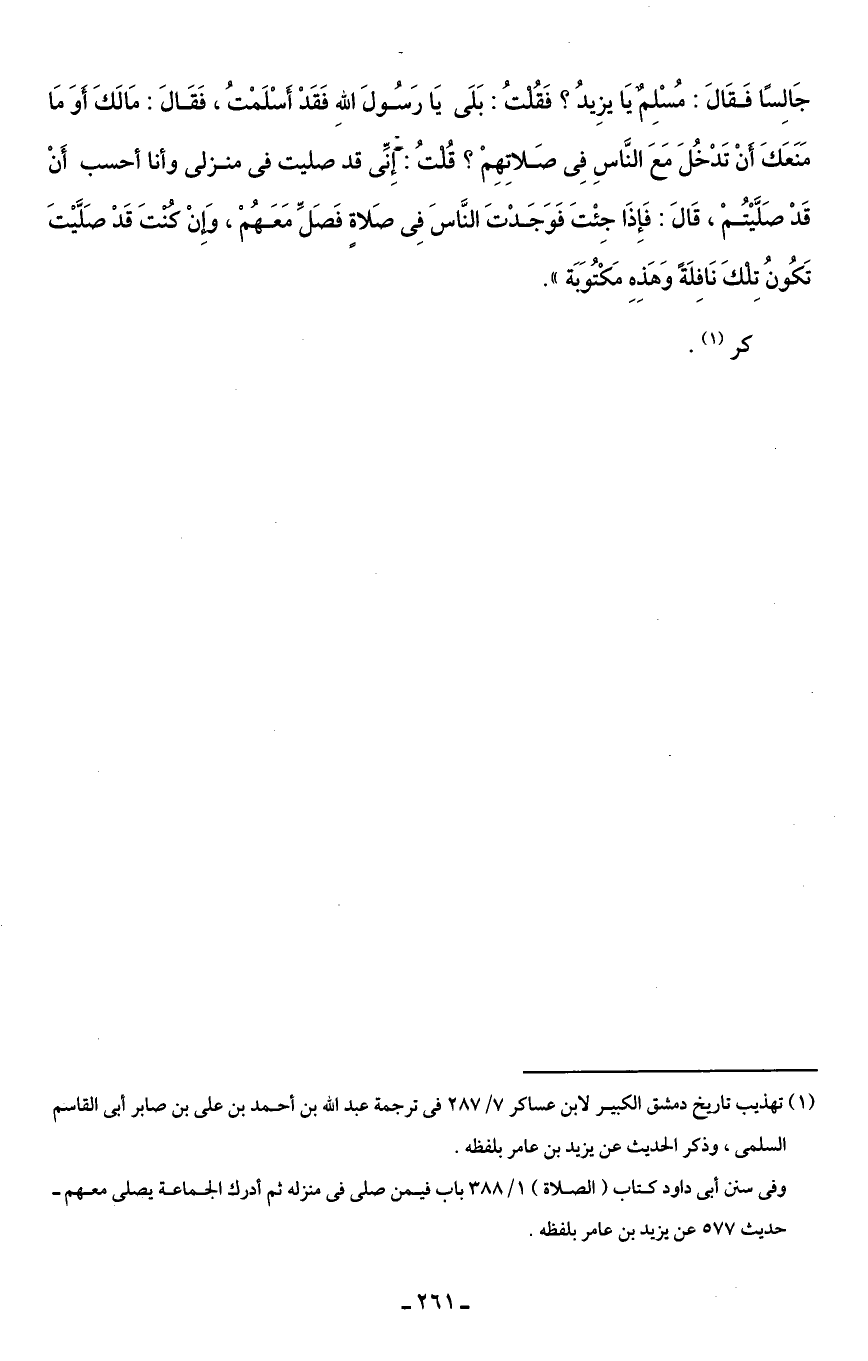 جَالِسًا فَقَالَ: مُسْلِمٌ يَا يزِيدُ؟ فَقُلتُ: بَلَى يَا رَسُولَ اللهِ فَقَدْ أسْلَمْتُ، فَقَالَ: مَا لَكَ أوَ مَا مَنَعَكَ أنْ تَدْخُلَ مَعَ النَّاسِ فِى صَلاِتهِمْ؟ قُلتُ: إنِّى قد صليت في منزلى وأنا أحسب أَنْ قَدْ صَلَّيْتُمْ، قَالَ: فَإِذَا جِئْتَ فَوَجَدْتَ النَّاسَ فِى صَلاةٍ فَصَل مَعَهُمْ، وإنْ كنتَ قَدْ صَليْتَ تَكُونُ تِلكَ نَافِلَةً وَهَذِهِ مَكْتُوَبَة".