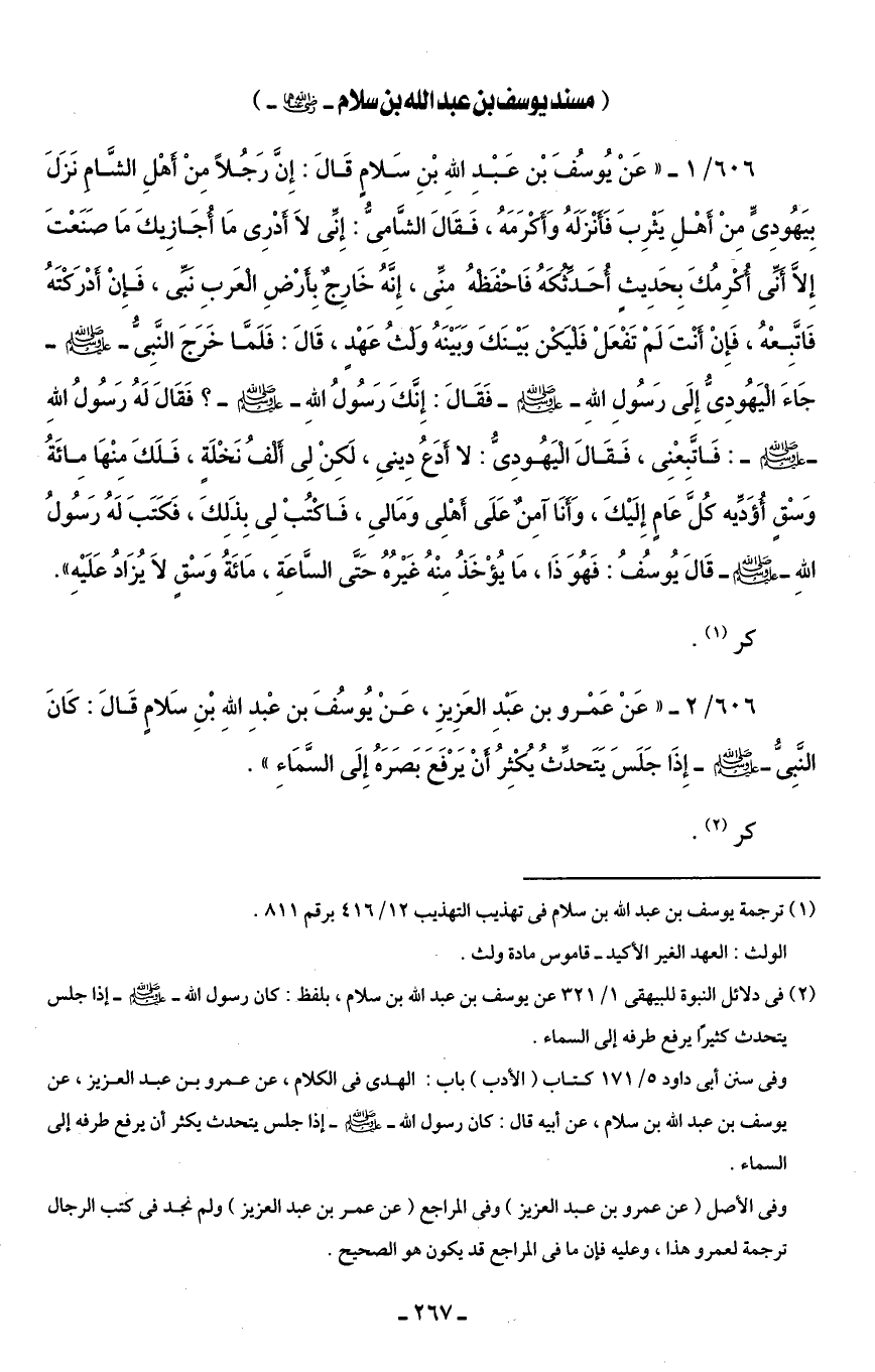 606/ 1 - " عَنْ يُوسُفَ بْن عَبْدِ اللهِ بْنِ سَلام قَالَ: إِنَّ رَجُلًا مِنْ أهْلِ الشَّام نَزَلَ بِيَهُودىٍّ مِنْ أهْلِ يَثْرِبَ فَأنزَلَهُ وَأكرَمَهُ، فَقَالَ الشَّامِىُّ: إِنِّى لَا أدْرِى مَا أُجَازِيكَ مَا صنَعْتَ إِلَّا أني أكرِمُكَ بِحَدِيث أحَدَثكَهُ فَاحْفَظهُ مِنِّى، إِنَّهُ خَارِج بِأرْضِ العَربِ نبِّى، فَإِنْ أدْرَكْتَهُ فَاتَّبِعْهُ، فَإِنْ أنْتَ لَمْ تَفْعَلْ فَليَكْن بَيْنَكَ وَبَيْنَهُ وَلثُ عَهْدٍ، قَالَ: فَلَمَّا خَرَجَ النَّبِىُّ - صلى الله عليه وسلم - جَاءَ اليَهُودِىُّ إِلَى رَسُولِ اللهِ - صلى الله عليه وسلم - فَقَالَ: إِنَّكَ رَسُولُ اللهِ - صلى الله عليه وسلم -؟ فَقَالَ لَهُ رَسُولُ اللهِ - صلى الله عليه وسلم -: فَاتَّبِعْنِى، فَقَالَ اليَهُودِىُّ: لا أَدعُ دِينىِ، لَكِنْ لِى ألفُ نَخْلَةٍ، فَلَكَ مِنْهَا مِائَةُ وَسْقٍ أُؤَدِّيه كُلَّ عَامٍ إِلَيْكَ، وَأنَا آمِن عَلَى أهْلِى وَمَالي، فَاكتُبْ لِى بِذَلِكَ، فَكَتَبَ لَهُ رَسُولُ اللهِ - صلى الله عليه وسلم - قَالَ يُوسُفُ: فَهُوَ ذَا، مَا يُؤْخَذُ مِنْهُ غَيْرُهُ حَتَّى السَّاعَةِ، مَائَةُ وَسْقٍ لَا يُزَادُ عَلَيْهِ".
