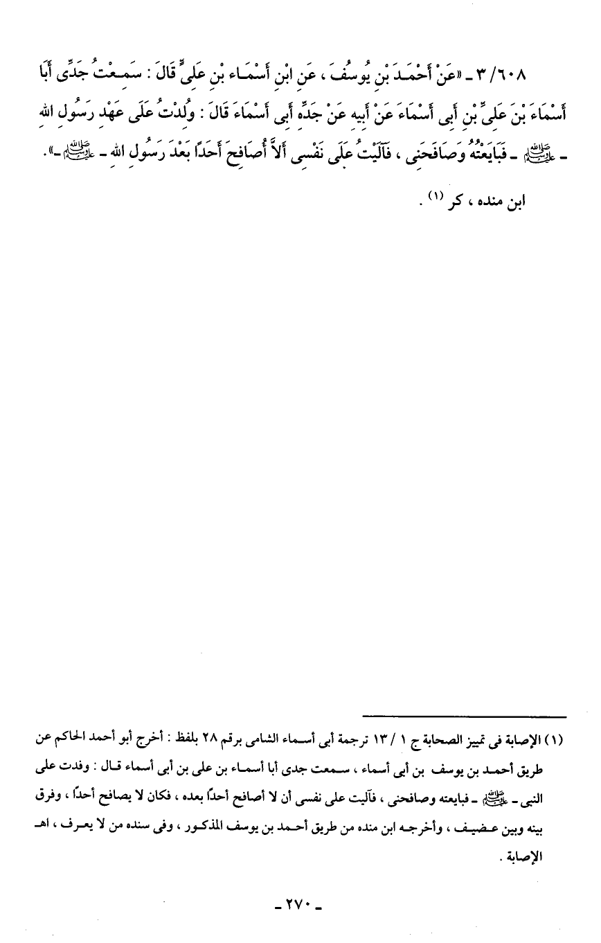 608/ 3 - "عَنْ أحْمَدَ بْنِ يُوسُفَ، عَنِ ابْنِ أسْمَاء بْنِ عَلِى قَالَ: سَمِعْتُ جَدِّى أبَا أسْمَاءَ بْنَ عَلِى بْنِ أبِى أسْمَاءَ عَنْ أبِيهِ عَنْ جَدِّهِ أبِى أسْمَاءَ قَالَ: وُلِدْتُ عَلَى عَهْدِ رَسُولِ اللهِ - صلى الله عليه وسلم - فَبَايَعْتُهُ وَصَافَحَنِى، فآلَيْتُ عَلَى نَفْسِى ألا أصَافِحَ أحَدًا بَعْدَ رَسُولِ اللهِ - صلى الله عليه وسلم -".