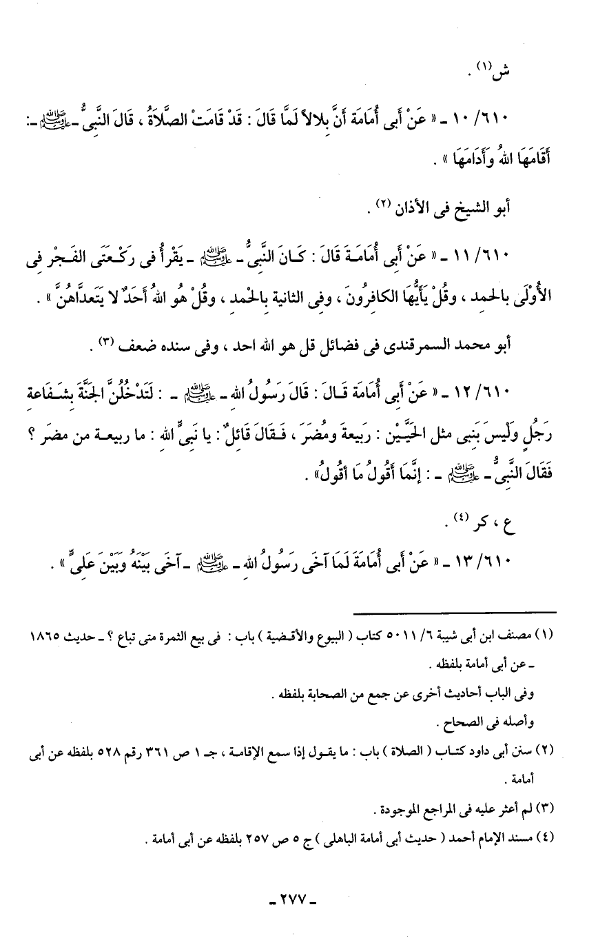 610/ 10 - "عَنْ أَبى أُمَامَة أَنَّ بِلالا لَمَّا قَالَ: قَدْ قَامَتْ الصَّلَاةُ، قَالَ النَّبِىُّ - صلى الله عليه وسلم -: أقَامَهَا اللهُ وَأَدَامَهَا".
