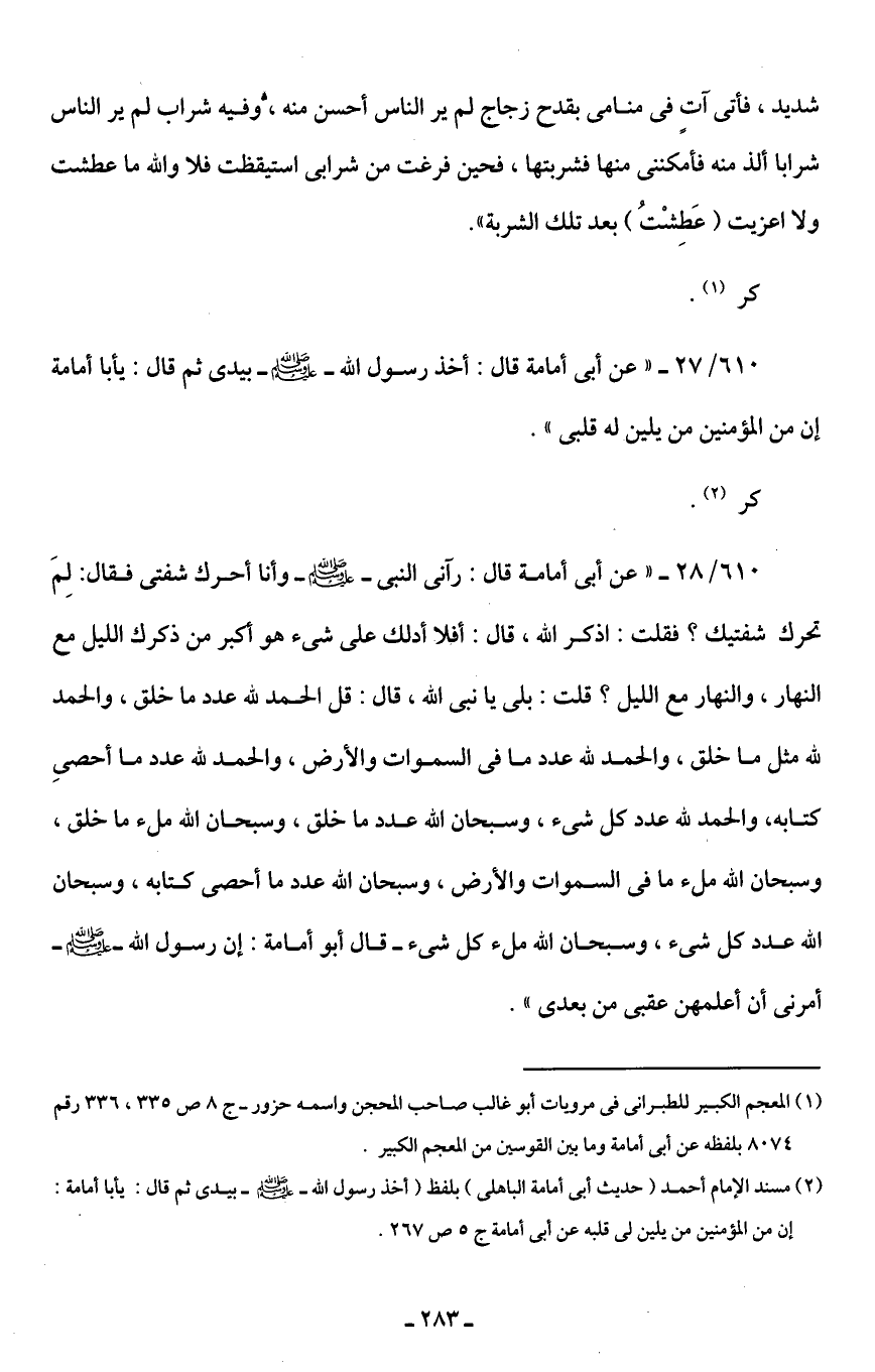 610/ 28 - "عن أبى أمامة قال: رآنى النبى - صلى الله عليه وسلم - وأنا أحرك شفتى فقال: لِمَ تحرك شفتيك؟ فقلت: اذكر الله، قال: أفلا أدلك على شئ هو أكبر من ذكرك الليل مع النهار، والنهار مع الليل؟ قلت: بلى يا نبى الله، قال: قل الحمد لله عدد ما خلق، والحمد لله مثل ما خلق، والحمد لله عدد ما في السموات والأرض، والحمد لله عدد ما أحصى كتابه، والحمد لله عدد كل شئ، وسبحان الله عدد ما خلق، وسبحان الله ملء ما خلق، وسبحان الله ملء ما في السموات والأرض، وسبحان الله عدد ما أحصى كتابه، وسبحان الله عدد كل شئ، وسبحان الله ملء كل شئ - قال أبو أمامة: إن رسول الله - صلى الله عليه وسلم - أمرنى أن أعلمهن عقبى من بعدى".