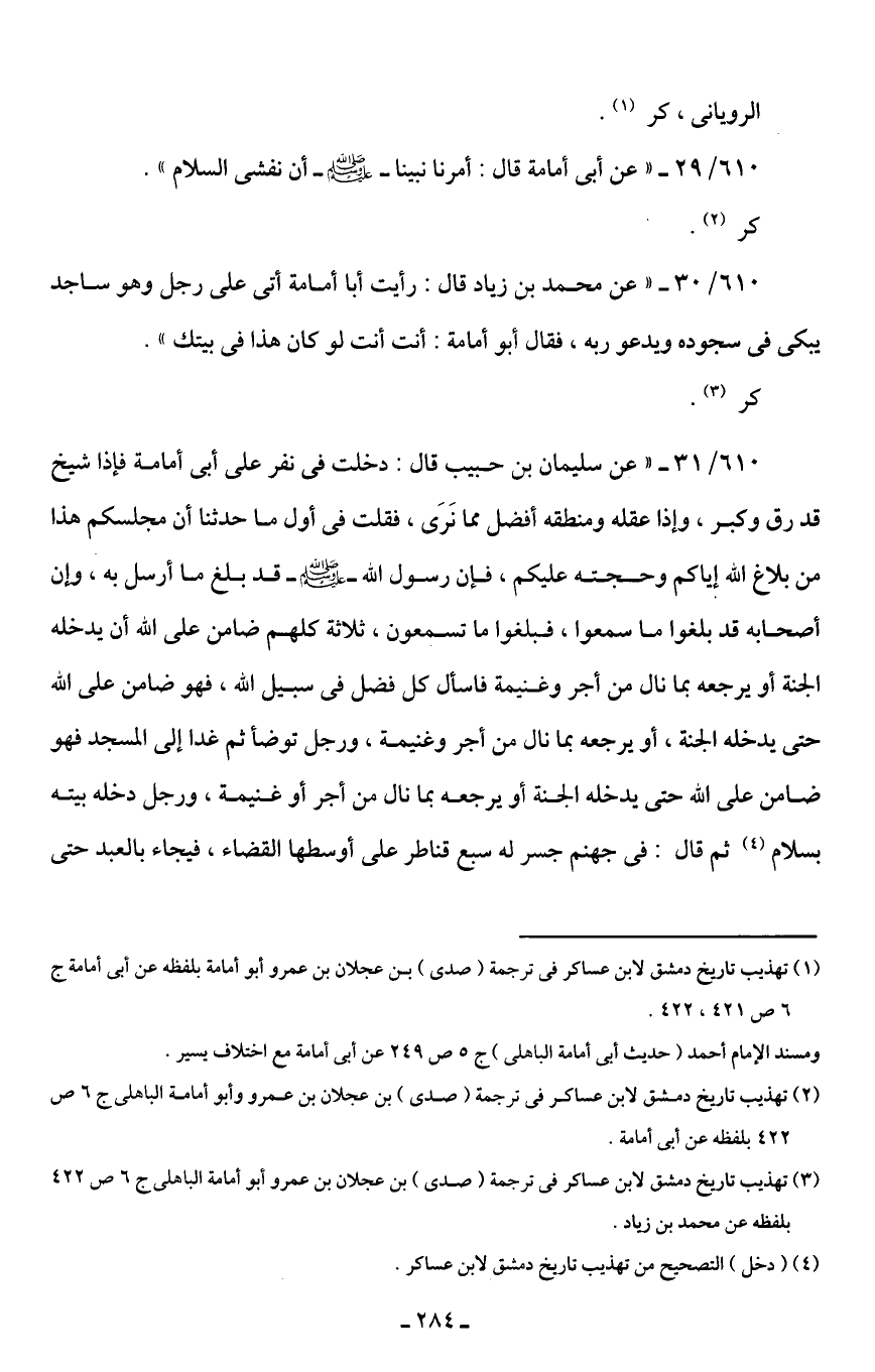 (¬2) تهذيب تاريخ دمشق لابن عساكر في ترجمة (صدى) بن عجلان بن عمرو وأبو أمامة الباهلى ج 6 ص 422 بلفظه عن أبى أمامة.