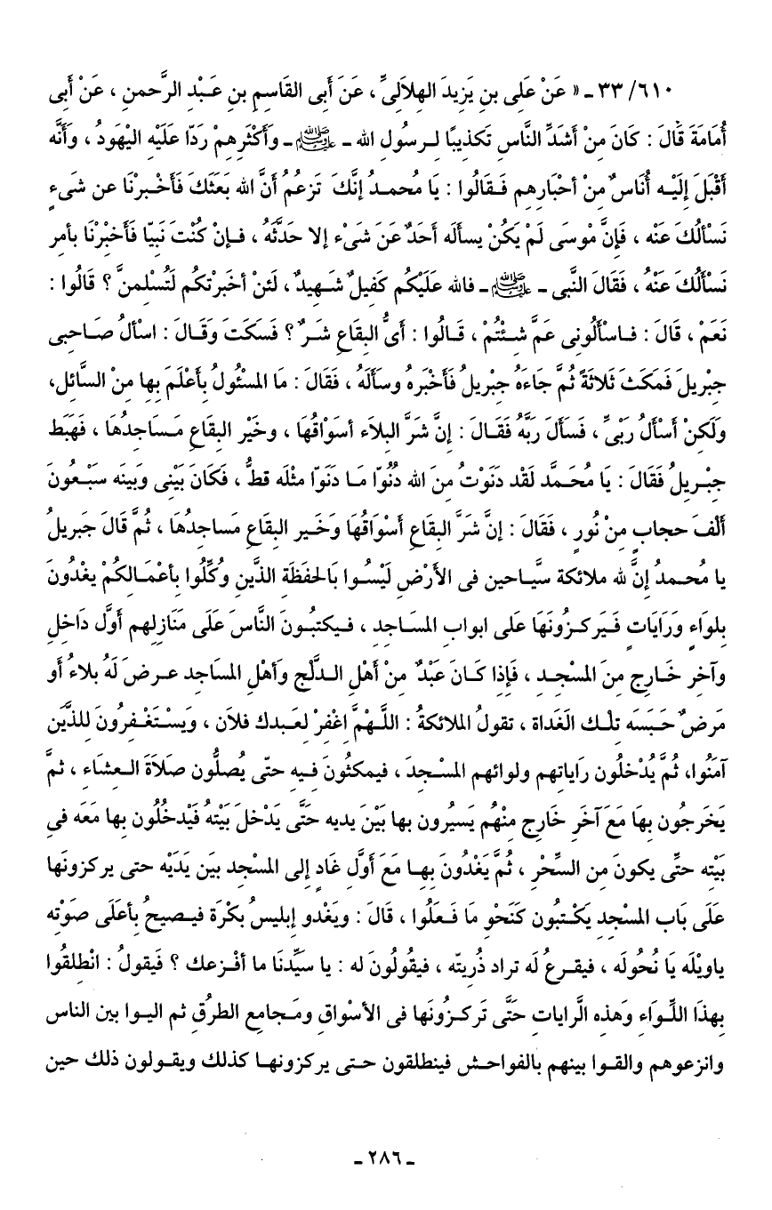 610/ 33 - "عَنْ عَلِى بنِ يَزِيدَ الهِلَالِىِّ، عَنَ أبِي القَاسم بنِ عَبْدِ الرَّحمنِ، عَنْ أبِي أُمَامَةَ قالَ: كَانَ مِنْ أَشَدِّ النَّاسِ تَكذِيبًا لِرسُولِ الله - صلى الله عليه وسلم - وَأَكْثَرِهِمْ رَدّا عَلَيْهِ اليْهَودُ، وَأَنَّه أقْبَلَ إِلَيْه أُنَاسٌ مِنْ أحْبَارِهِم فَقَالُوا: يَا مُحمدُ إنَّكَ تَزعُمُ أنَّ الله بَعَثَكَ فَأَخْبرْنَا عن شَئٍ نَسْألُكَ عَنْه، فَإِنَّ مْوسَى لَمْ يَكُنْ يسأَلَه أَحَدٌ عَنَ شَىْء إلا حَدَّثهُ، فإنْ كنتَ نَبِيّا فَأَخبرْنَا بأمِر نَسْأَلُكَ عَنْهُ، فَقَالَ النَّبى - صلى الله عليه وسلم - فالله عَلَيكُم كَفِيلٌ شَهِيدٌ، لَئنْ أخَبرْتكُم لَتُسْلِمنَّ؟ قَالُوا: نَعَمْ، قَالَ: فاسْأَلُونِى عَمَّ شِئْتُمْ، قَالُوا: أَيُّ البِقَاع شَرٌ؟ فَسَكَتَ وَقَالَ: أسْألُ صَاحِبى جِبْريلَ فَمَكَثَ ثَلاثَةً ثُمَّ جَاءَهُ جِبْريلُ فَأَخْبَرهُ وسَأَلَهُ، فَقَالَ: مَا المسْئُولُ بِأَعْلَمَ بِهِا مِنْ السَّائِل، وَلَكِنْ أسْأَلُ رَبْيِّ، فَسَأَلَ رَبَّهُ فَقَالَ: إِن شَرَّ البِلَاء أسَوْاقُهَا، وخَيْر البِقَاع مَسَاجِدُهَا، فَهَبَط جِبْريِلُ فَقَالَ: يَا مُحَمَّد لَقْد دَنَوْتُ مِنَ الله دُنُوّا مَا دَنَوّا مثْلَه قطُّ، فَكَانَ بَيْنِى وَبينَه سَبْعُونَ أَلْفَ حجاب مِنْ نُورٍ، فَقَالَ: إنَّ شَرَّ البِقَاع أَسْوَاقُهَا وَخَير البِقَاع مَساجِدُهَا، ثُمَّ قَالَ جَبريلُ يا مُحمدُ إِنَّ لله ملائكة سيَّاحين في الأَرْضِ لَيْسُوا بَالحفَظَةِ الذَّينِ وُكِّلُوا بِأعْمَالِكُمْ يغْدُونَ بِلوَاءٍ وَرَايَاتٍ فَيَركزُونَهَا عَلى أبوابِ المسَاجِد، فيكتبُونَ النَّاسَ عَلَى مَنَازِلِهم أوَّل دَاخِلِ وآخِر خَارِج مِنَ المسْجِدِ، فَإِذِا كَانَ عَبْدٌ مِنْ أَهْلِ الدَّلْج وَأهْلِ المسَاجِد عرضَ لَهُ بلاءُ أَو مَرضٌ حَبَسَه تِلْك الَغَداة، تقولُ الملائكةُ: اللَّهْمَّ اغْفِرْ لِعَبدك فلَان، وَيسْتَغْفِرُونَ لِلذَّيَن آمَنُوا، ثُمَّ يُدْخلُون رَاياتِهم ولوائهم المسْجِدَ، فيمكثُونَ فِيهِ حتّى يُصلُّون صَلَاةَ العِشَاءِ، ثمَّ يَخَرجُون بِهَا مَعَ آخَرِ خَارِج مِنْهُم يَسيُرون بها بَيْنَ يديه حَتَّى يَدْخلَ بَيْتهُ فَيْدخُلُون بِها مَعَه في بَيْتِه حتَّى يكونَ مِن السِّحْرِ، ثُمَّ يَغْدُونَ بِهِا مَعَ أَوَّلِ غَادٍ إِلى المسْجِد بيَن يَدَيْه حتى يركزونَها عَلَى بَاب المسْجِدِ يَكْتبُون كَنَحْوِ مَا فَعَلُوا، قَالَ: ويَغْدو إِبليسُ بكْرَة فيصيحُ بِأعَلَى صَوْتِه يا ويْلَه يَا نُحُولَه، فيقرعُ لَه تراد ذُرِيته، فيقُولُونَ له: يا سيِّدنَا ما أفْزعك؟ فَيقولُ: انْطِلقُوا بِهذَا اللِّوَاءِ وَهذِه الَّراياتِ حَتَّى تَركزُونَها في الأسْواقِ ومَجامِع الطرُقِ ثم اليوا بين الناس وانزعوهم والقوا بينهم بالفواحش فينطلقون حتى يركزونها كذلك ويقولون ذلك حين