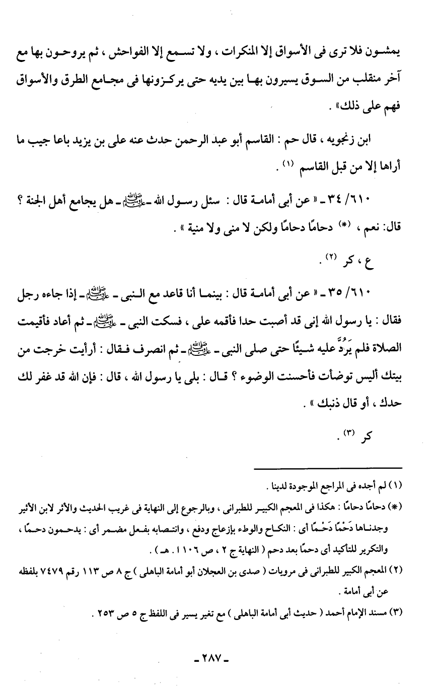 610/ 34 - "عن أبى أمامة قال: سئل رسول الله - صلى الله عليه وسلم - هل يجامع أهل الجنة؟ قال: نعم، (*) دحامًا دحامًا ولكن لا منى ولا منية".