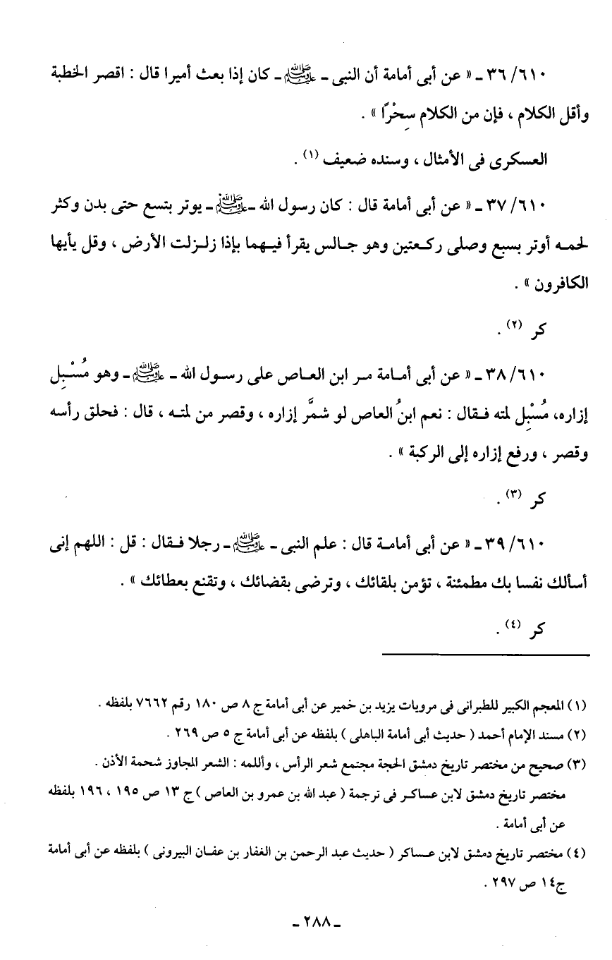 610/ 36 - "عن أبى أمامة أن النبى - صلى الله عليه وسلم - كان إذا بعث أميرا قال: اقصر الخطبة وأقل الكلام، فإن من الكلام سِحْرًا".