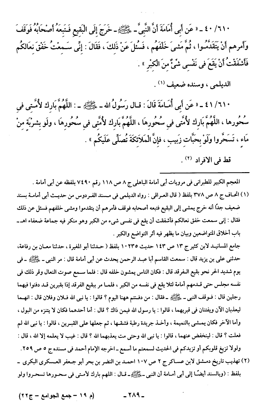 610/ 40 - "عَن أبِي أُمَامَةَ أَنَّ النَّبِىَّ - صلى الله عليه وسلم - خَرَجَ إِلَى الْبَقِيع فَتَبِعَهُ أَصْحَابُهُ فَوَقَفَ وَأَمرهم أَنْ يَتَقَدَّمُوا، ثُمَّ مَشىَ خَلفَهُم، فَسُئلَ عَنْ ذَلِكَ، فَقَالَ: إِنِّى سَمِعْتُ خَفْقَ نِعَالكُم فَأَشْفَقْتُ أَنْ يَقَعَ في نَفْسِى شَيْءٌ مِنَ الْكِبْرِ".