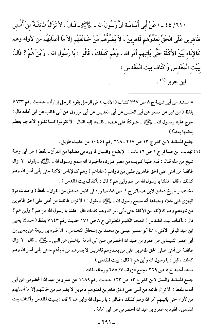 610/ 44 - "عَنْ أُبِي أُمَامَة أنَّ رَسُولَ الله - صلى الله عليه وسلم - قَالَ: لَا تَزَالُ طَائِفَةٌ مِنْ أُمَّتِى ظَاهِرِين عَلَى الْحَقِّ لِعَدُوِّهم قَاهِرِينَ، لَا يَضُرُّهُم مَنْ خَالَفَهُم إلَا مَا أَصَابَهُم من لأواء وهم كَالإِنَاءِ بَيْنَ الأَكلَةِ حَتَّى يَأتيهم أَمَر الله، وَهُم كَذَلِكَ، قَالُوا: يَا رَسُول الله: وَأيْنَ هُمْ؟ قَالَ: بِبَيْتِ الْمَقْدِس وَأكْنَاف بيت الْمَقْدسِ".