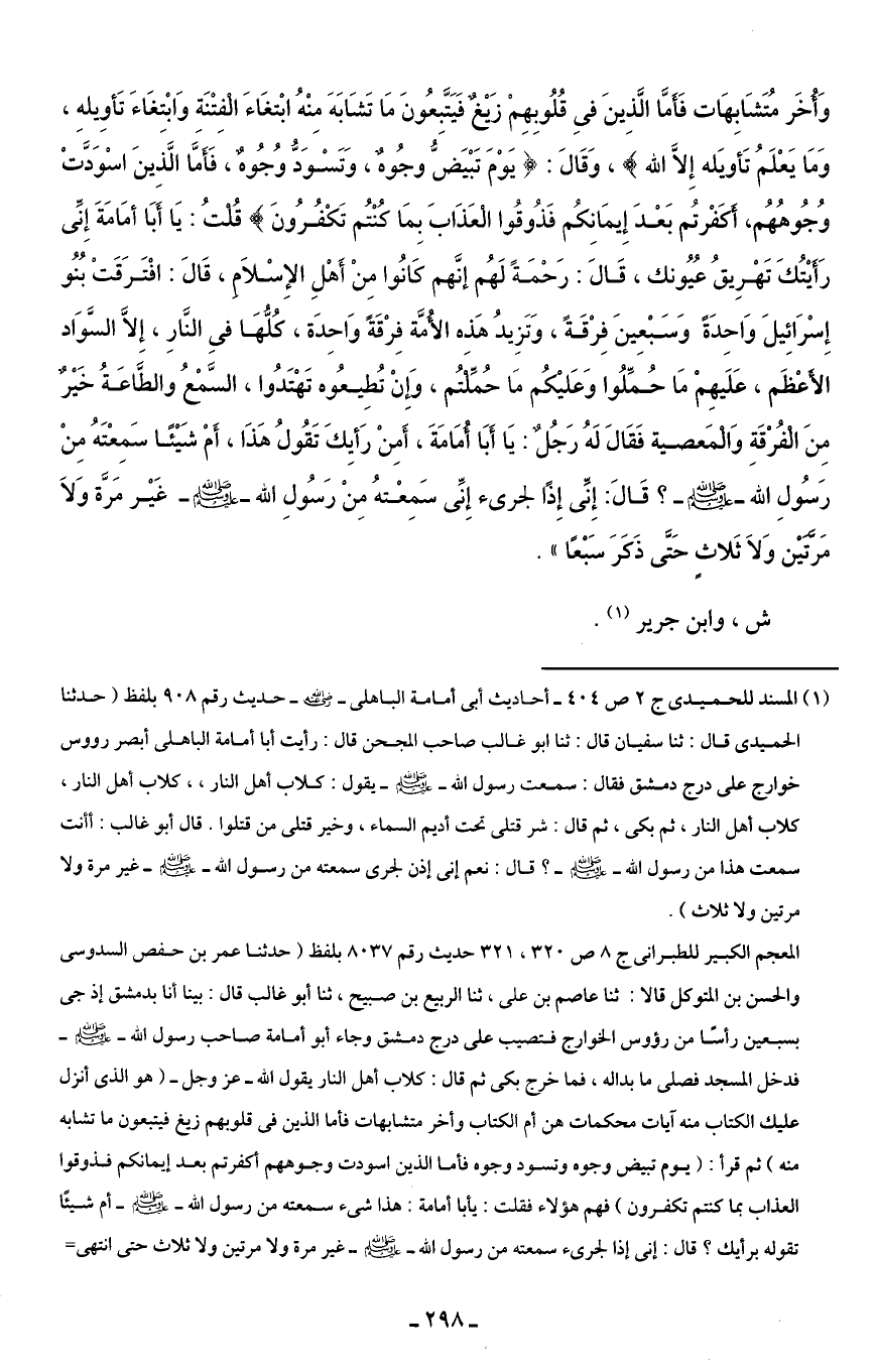 وَأُخَرُ مُتَشَابِهَاتٌ فَأَمَّا الَّذِينَ فِي قُلُوبِهِمْ زَيْغٌ فَيَتَّبِعُونَ مَا تَشَابَهَ مِنْهُ ابْتِغَاءَ الْفِتْنَةِ وَابْتِغَاءَ تَأْوِيلِهِ وَمَا يَعْلَمُ تَأْوِيلَهُ إِلَّا اللَّهُ}، وَقَالَ: {يَوْمَ تَبْيَضُّ وُجُوهٌ وَتَسْوَدُّ وُجُوهٌ فَأَمَّا الَّذِينَ اسْوَدَّتْ وُجُوهُهُمْ أَكَفَرْتُمْ بَعْدَ إِيمَانِكُمْ فَذُوقُوا الْعَذَابَ بِمَا كُنْتُمْ تَكْفُرُونَ} قُلتُ: يَا أَبَا أمَامَةَ إِنِّى رَأَيْتُكَ تَهْرِيقُ عُيُونك، قَالَ: رَحْمَةً لَهُم إنَّهم كَانُوا مِنْ أَهْلِ الإِسْلَامِ، قَالَ: افْتَرَقَتْ بُنُو إِسْرَائِيلَ وَاحِدَةً وَسَبْعِينَ فِرْقَةً، وَتَزِيدُ هَذِه الأُمَّة فِرْقَةً وَاحِدَة، كُلُّهَا في النَّارِ، إِلَّا السَّوَاد الأعْظَم، عَلَيهِمْ مَا حُمِّلُوا وَعَليكم مَا حُمِّلتُم، وَإِنْ تُطِيعُوه تَهْتَدُوا، السَّمْعُ والطَّاعَةُ خَيْرٌ مِنَ الْفُرْقَةِ وَالْمَعصية فَقَالَ لَهُ رَجُلٌ: يَا أَبَا أُمَامَةَ، أَمِنْ رَأيِكَ تَقُولُ هَذَا، أَمْ شَيْئًا سَمِعْتَهُ مِنْ رَسُولِ الله - صلى الله عليه وسلم -؟ قَالَ: إِنِّى إِذًا لجرئ إِنِّى سَمِعْتهُ مِنْ رَسُولِ الله - صلى الله عليه وسلم - غَيْر مَرَّة وَلَا مَرتيْن وَلَا ثَلاثٍ حَتَّى ذَكَرَ سَبْعًا".