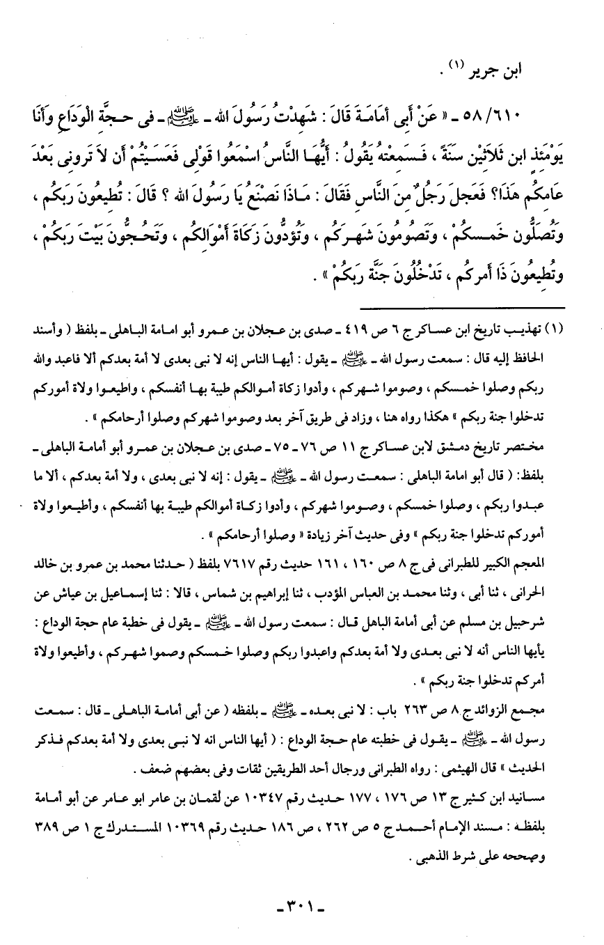 610/ 58 - "عَنْ أَبِى أمَامَةَ قَالَ: شَهِدْتُ رَسُولَ الله - صلى الله عليه وسلم - في حجَّةِ الْوَدَاع وَأنَا يَوْمَئِذٍ ابن ثَلَاثِيْن سَنَةً، فَسَمِعْتهُ يَقُولُ: أيُّهَا النَّاسُ اسْمَعُوا قَوْلِى فَعَسَيْتُمْ أن لَا تَرونِى بَعْدَ عَامِكُم هَذَا؟ فَعَجلَ رَجُلٌ مِنَ النَّاسِ فَقَالَ: مَاذَا نَصْنَعُ يَا رَسُولَ الله؟ قَالَ: تُطِيعُونَ رَبكُم، وَتُصَلُّون خَمسكُمْ، وَتَصُومُونَ شَهرَكُم، وَتُؤدُّونَ زَكَاةَ أمْوَالِكُم، وَتَحُجُّونَ بَيْتَ رَبكُمْ، وتُطِيعُونَ ذَا أَمركُم، تَدْخُلُونَ جَنَّة رَبكُمْ".