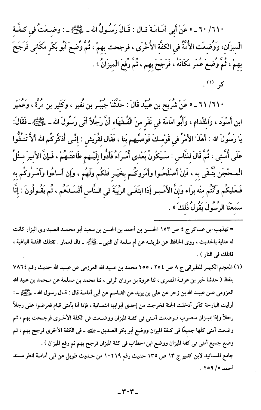 610/ 60 - "عَنْ أَبِي أمَامَةَ قال: قَالَ رَسُولُ الله - صلى الله عليه وسلم -: وضِعْتُ في كفَّةِ الْمِيزَانِ، وَوُضِعَت الأُمَّةُ في الكفَّةِ الأُخْرَى، فرجحت بِهِمْ، ثُمَّ وُضِعَ أبُو بَكْر مَكَانِى فَرَجَحَ بِهِمْ، ثُمَّ وُضعَ عُمَر مَكَانَهُ، فَرَجَحَ بِهِم، ثُمَّ رُفِعَ الْمِيزَانُ".