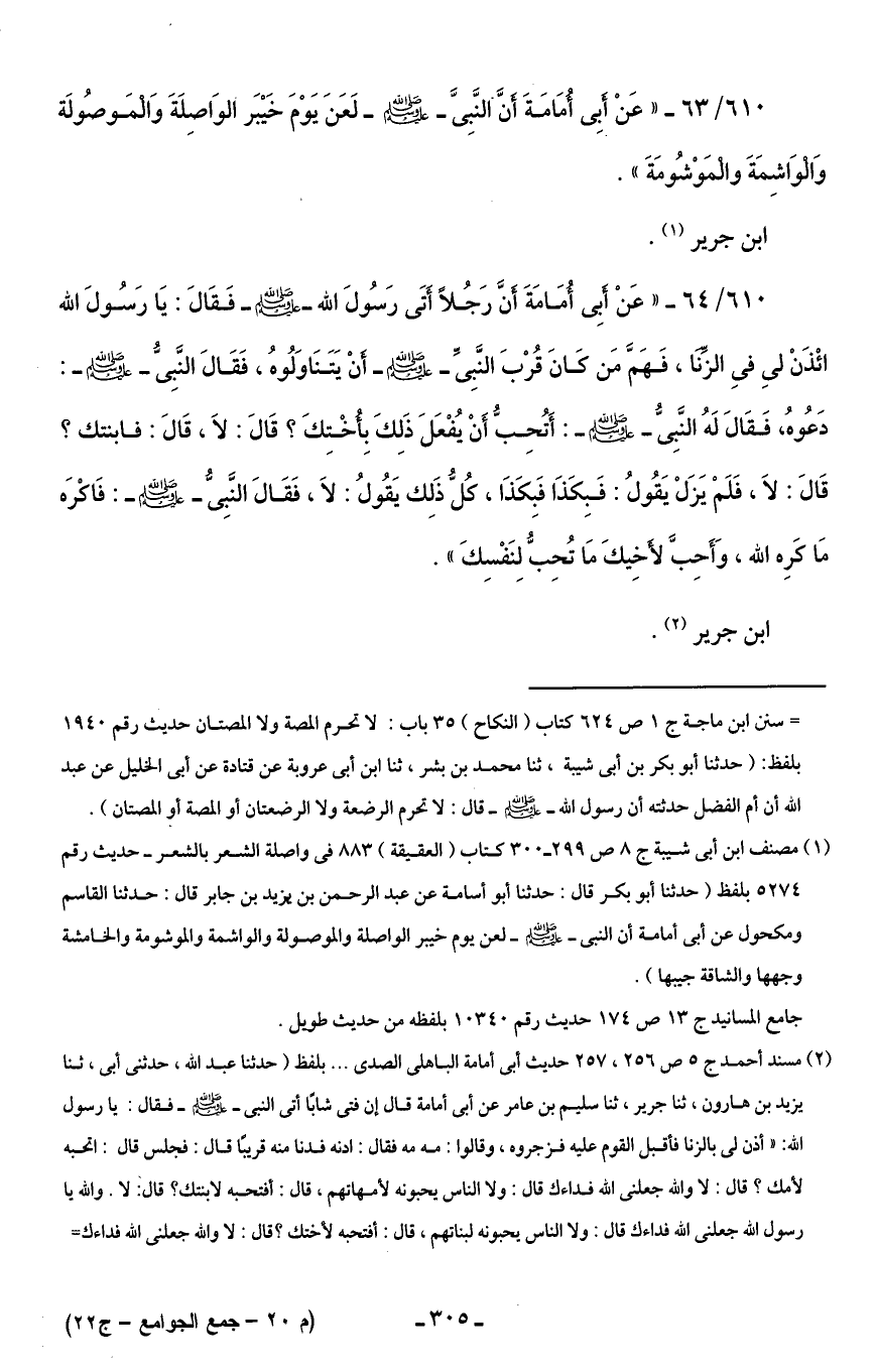 610/ 63 - "عَنْ أبِي أُمَامَةَ أنَّ النَّبِىَّ - صلى الله عليه وسلم - لَعَنَ يَوْمَ خَيْبَر الوَاصِلَةَ وَالْمَوصُولَة وَالْوَاشِمَةَ والْمَوْشُومَةَ".