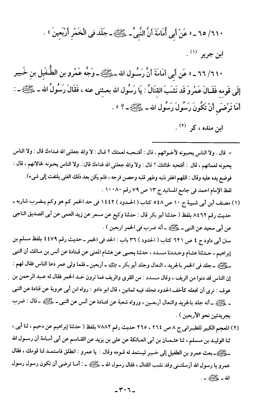 610/ 65 - "عَنْ أَبِى أُمَامَةَ أَنَّ النَّبِىَّ - صلى الله عليه وسلم - جَلَد في الْخَمْرِ أَرْبَعِينَ".