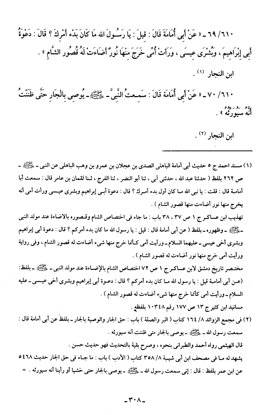 610/ 70 - "عَنْ أَبِي أُمَامَة قَالَ: سَمِعتُ النَّبِيَّ - صلى الله عليه وسلم - يُوصِي بِالْجَارِ حَتَّى ظَنَنْتُ أَنَّهُ سَيُوَرِّثُهُ".