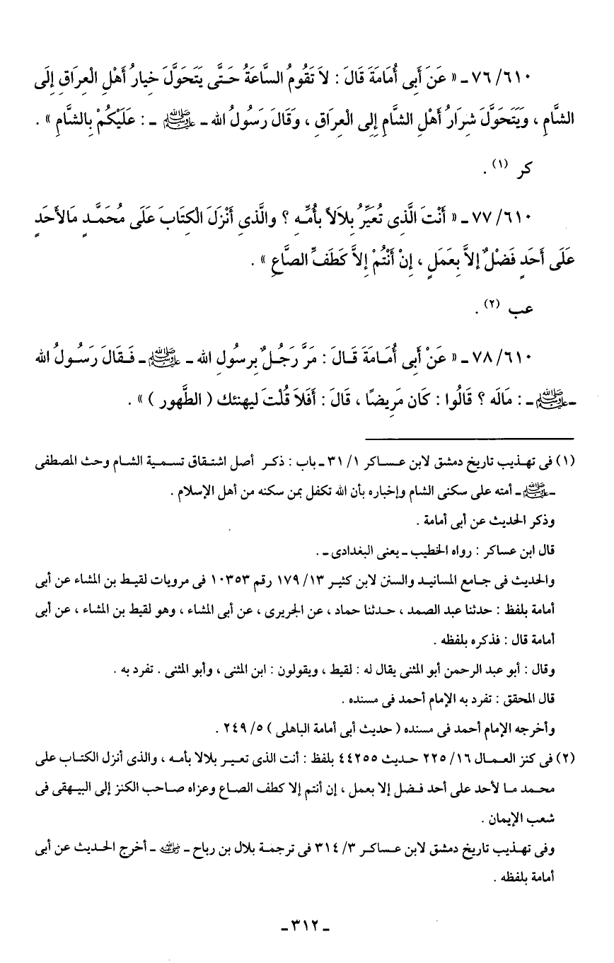610/ 76 - "عَنَ أَبِي أُمَامَةَ قَالَ: لَا تَقُومُ السَّاعَةُ حَتَّى يَتَحَوَّلَ خِيارُ أَهْلِ الْعِرَاقِ إِلَى الشَّامِ، وَيَتَحَوَّلَ شِرَارُ أَهْلِ الشَّامِ إِلِى الْعِرَاقِ، وَقَالَ رَسُولُ الله - صلى الله عليه وسلم -: عَلَيْكُمْ بِالشَّامِ".