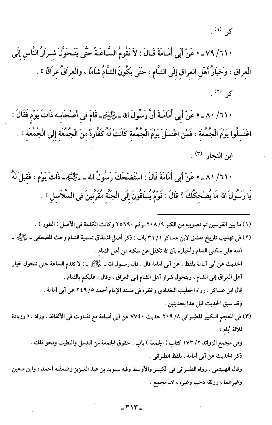 610/ 79 - "عَنْ أَبَي أُمَامَةَ قَالَ: لَا تَقُومُ السَّاعَةُ حَتَّى يَتَحَوَّلَ شِرَارُ النَّاسِ إِلَى الْعِراقِ، وَخِيَارُ أَهْلِ العِراقِ إِلَى الشَّامِ، حَتَى يَكُونَ الشَّامُ شَامًا، والْعِرَاقُ عِرَاقًا".