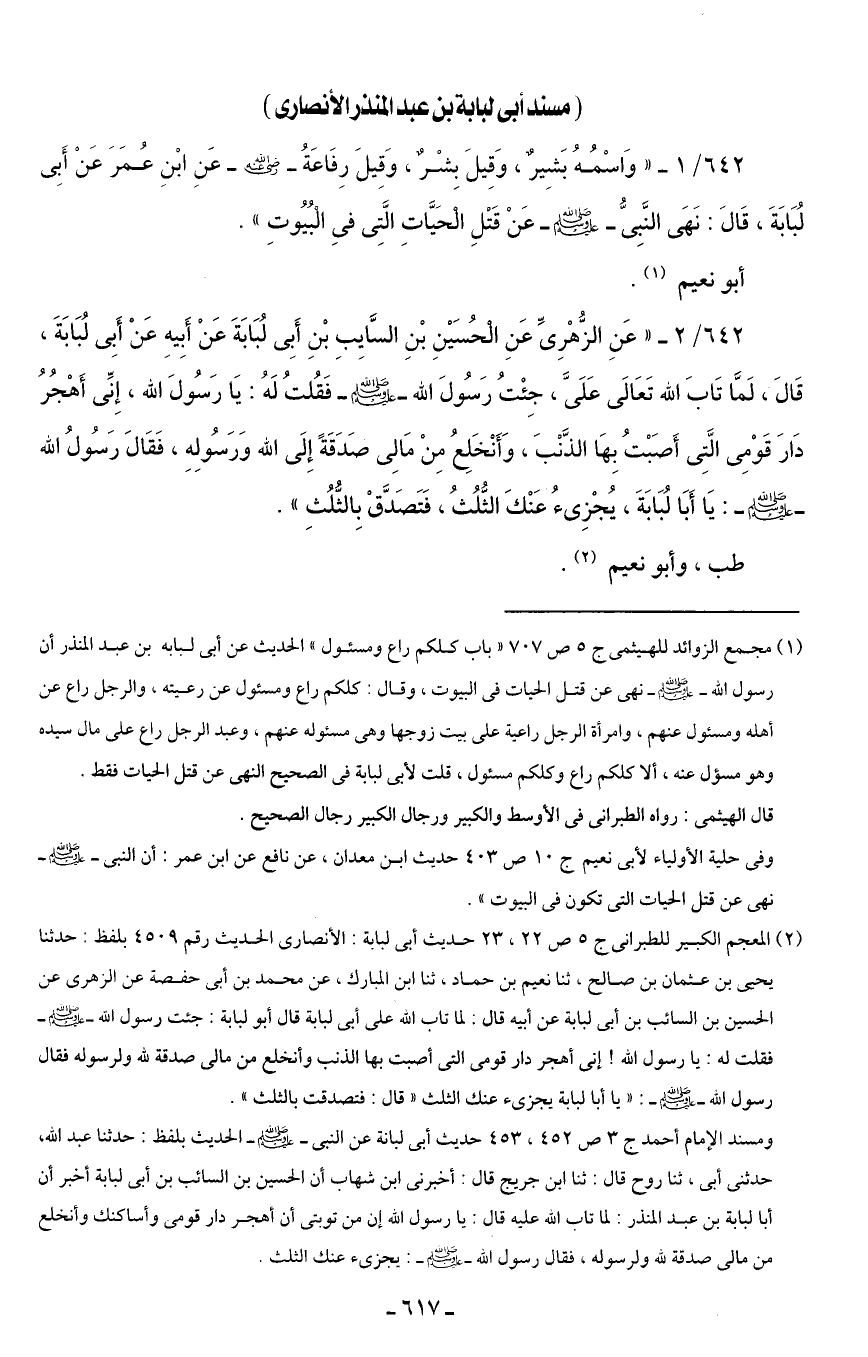 642/ 1 - " وَاسْمُهُ بَشِيرٌ، وَقِيلَ بِشْرٌ، وَقِيلَ رِفَاعَةُ - رضي الله عنه - عَنِ ابْنِ عُمَرَ عَنْ أَبِى لُبَابَةَ، قَالَ: نَهَى النَّبِىُّ - صلى الله عليه وسلم - عَنْ قَتْلِ الْحَيَّاتِ الَّتِى في الْبُيُوتِ".
