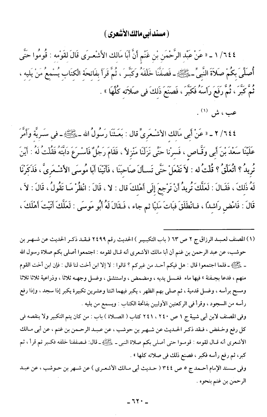 (¬1) المصنف لعبد الرزاق ج 2 ص 63 (باب التكبير) الحديث رقم 2499 فقد ذكر الحديث عن شهر بن حوشب، عن عبد الرحمن بن غنم أن أبا مالك الأشعرى أنه قال لقومه: "اجتمعوا أصلى بكم صلاة رسول الله - صلى الله عليه وسلم - فلما اجتمعوا قال هل فيكم أحد من غيركم؟ قالوا: لا إلا ابن أخت لنا قال: فإن ابن أخت القوم منهم، فدعا بجفنة" فيها ماء فغسل يديه، ومضمض، واستنشق، وغسل وجهه ثلاثًا، وذراعية ثلاثًا ثلاثًا ومسح برأسه، وغسل قدميه، ثم صلى بهم الظهر، يكبر فيهما اثنتا وعشرين تكبيرة يكبر إذا سجد، وإذا رفع رأسه من السجود، وقرأ في الركعتين الأوليين بفاتحة الكتاب: ويسمع من يليه.